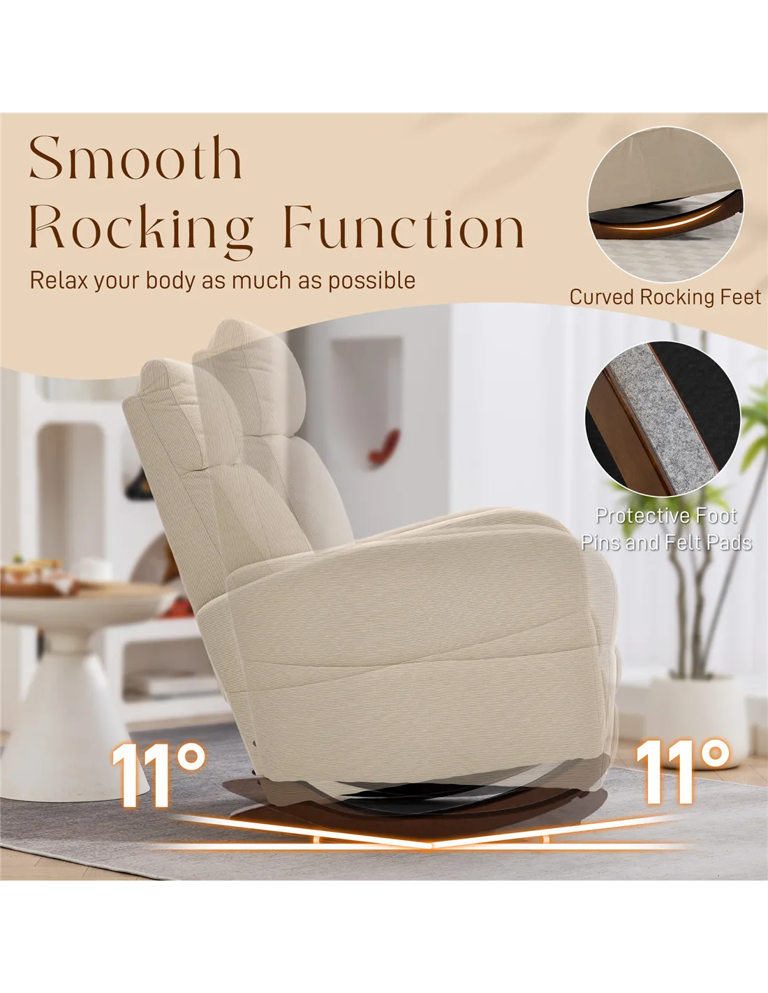 Enhance your relaxation with the HOMCOM Corduroy Rocking Armchair in Beige, designed for UK homes. This rocking chair features an 11° rocking base, providing a gentle, smooth forwards and backwards motion. Enjoy superior comfort from the thick padding and soft, stylish corduroy upholstery, crafted from 100% polyester. The armchair includes an angled backrest for optimal support during use. Stability is ensured by robust rubberwood legs, fitted with anti-tip foot pins and felt pads to protect your flooring. Two integrated side pockets offer practical storage for your magazines or remotes. Supporting up to 120 kg, this beige rocking armchair measures 67cm wide, 94cm deep, and 105cm high. This functional addition from FastDaddy combines comfort with practical design for your living space.