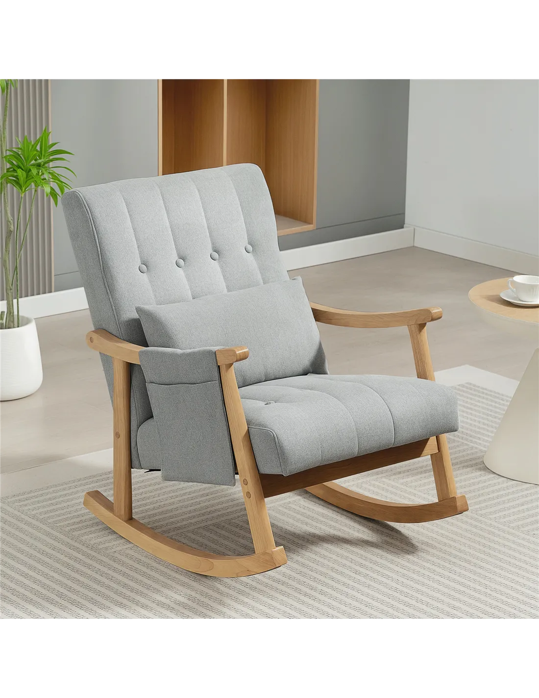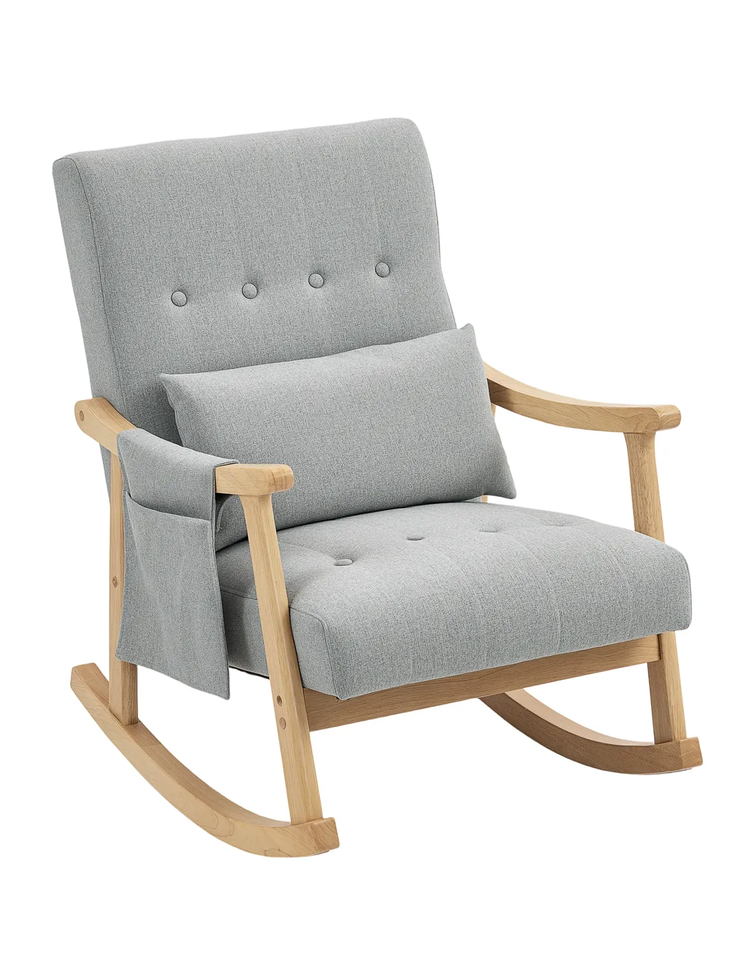 Enhance your UK home with the HOMCOM Wood Frame Rocking Accent Chair in Light Grey. This elegant chair offers a gentle 35° rocking motion, providing soothing relaxation for any room. Crafted with a strong rubberwood frame, it delivers lasting stability and support. You will experience maximum comfort from the thickly padded seat and back, upholstered in a smooth, cotton-look fabric. The design includes a high, slightly angled back and supportive arms, ensuring comprehensive comfort. A convenient side pocket keeps your small items within easy reach. The natural wood frame beautifully complements the light grey fabric, adding a contemporary touch. You also receive a small pillow for extra comfort. This chair supports a maximum load of 120 kg and assembly is simple.