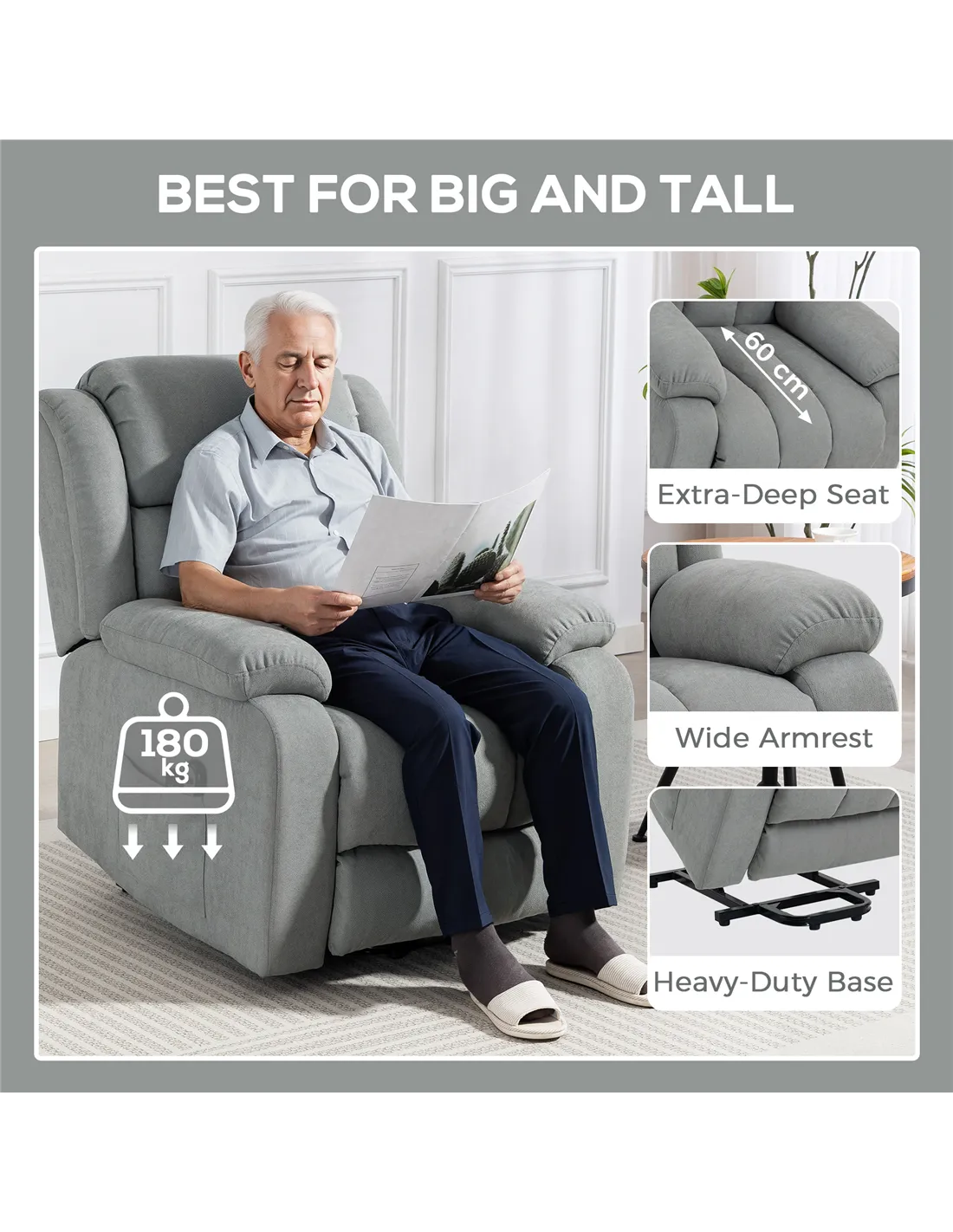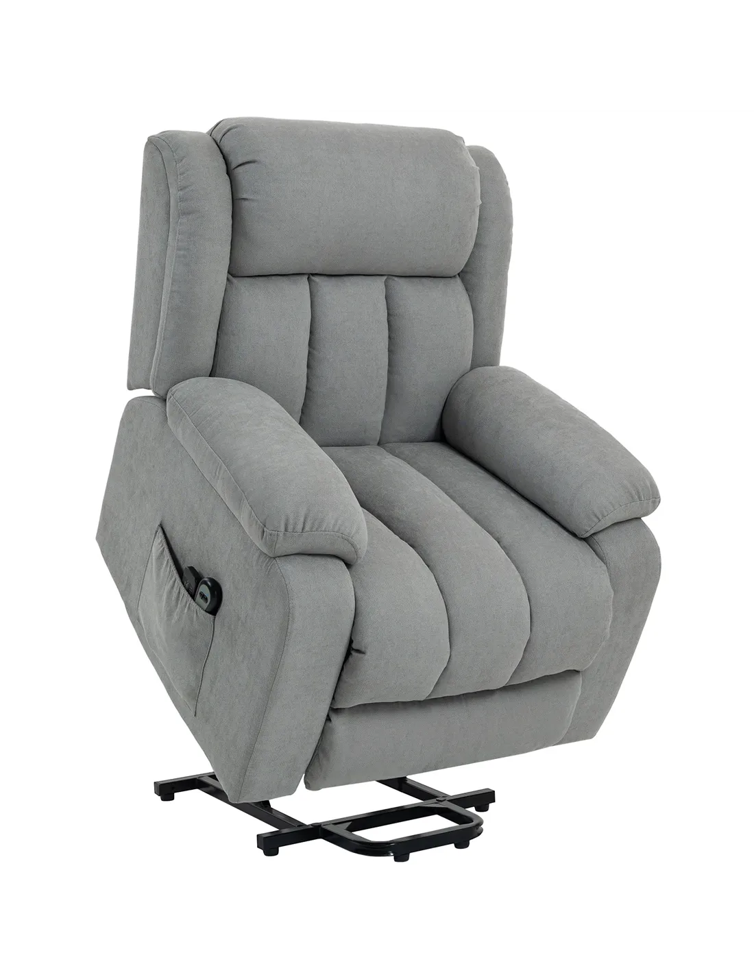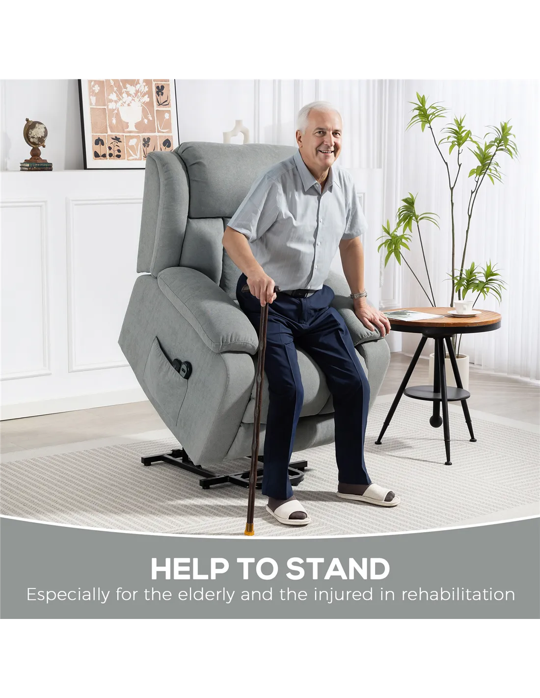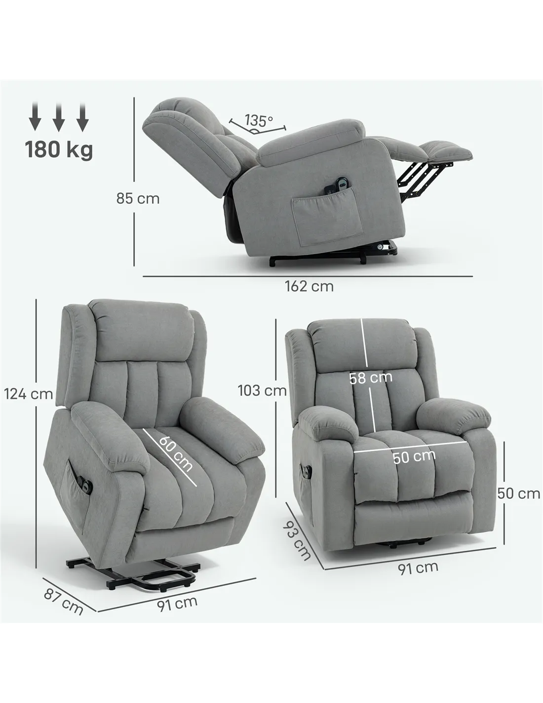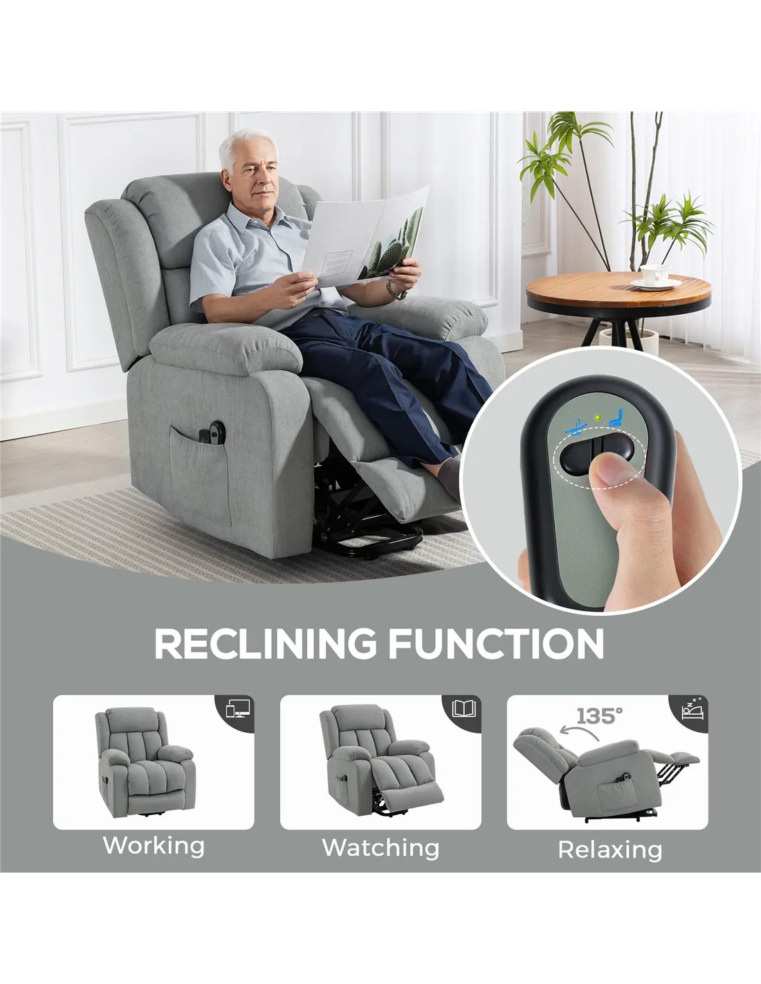 The HOMCOM Eight-Point Massage Electric Lift Chair in Light Grey offers both assistance and comfort. This electric recliner aids your independence with a gentle lift mechanism, making sitting down and standing up effortless. You control the 135° reclining back and footrest using the attached remote, achieving your preferred position. Eight integrated massage points target your back, lumbar, thighs, and legs. Choose from five intensities and eight modes, with a selectable 15 or 30-minute timer. A strong steel frame provides stability, supporting up to 180 kg. Enjoy superior comfort from the overstuffed thick padding, deep seat, wide armrests, and breathable linen-look fabric. Side pockets store your essentials conveniently. This chair supports your comfort and daily ease within your home.