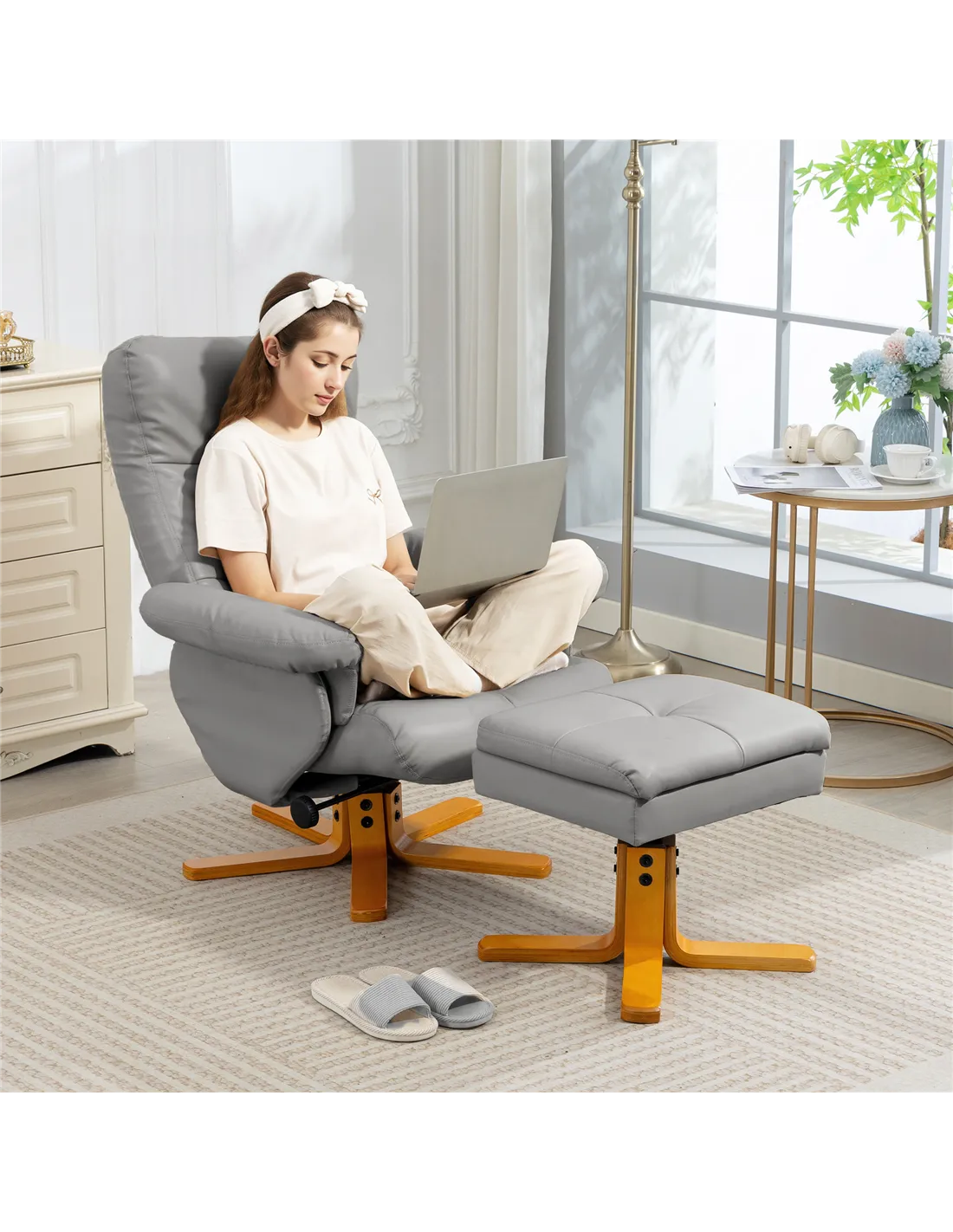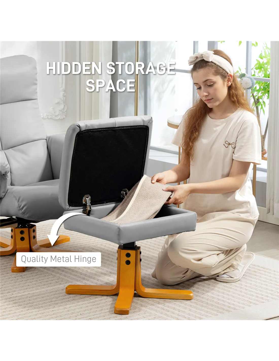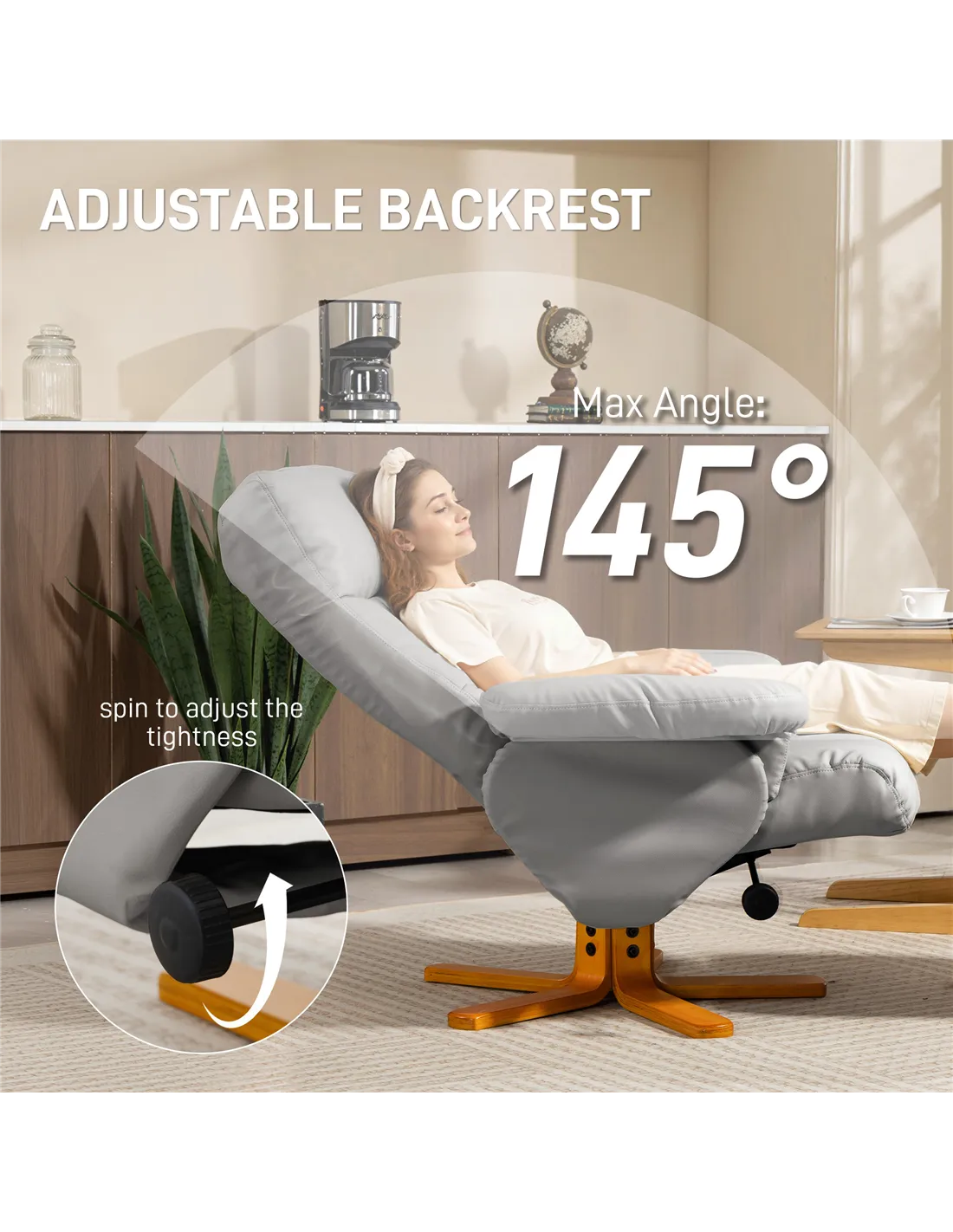 HOMCOM PU Leather Swivel Recliner Chair with Footstool, Wooden Base and Storage for Living Room, Light Grey