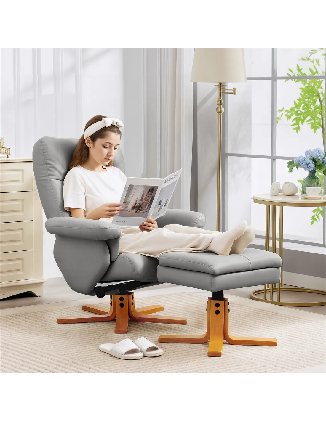 - A: This recliner chair offers a 360° swivel seat and a backrest that reclines up to 145°. It comes with a matching footstool that provides hidden storage. The chair features stylish faux leather upholstery and a polished wooden base, all in a light grey finish.
