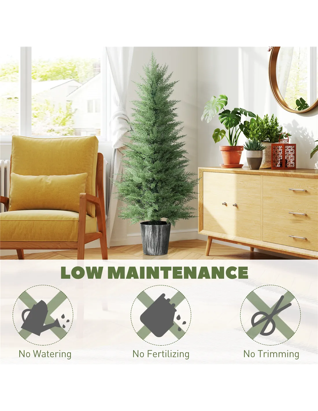 - A: These trees offer year-round vibrant greenery without the need for watering or pruning. They are UV-resistant, preventing fading, and suit both indoor and outdoor displays. They provide effortless elegance and save you time.