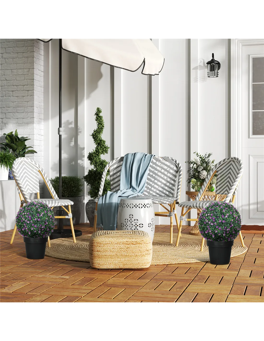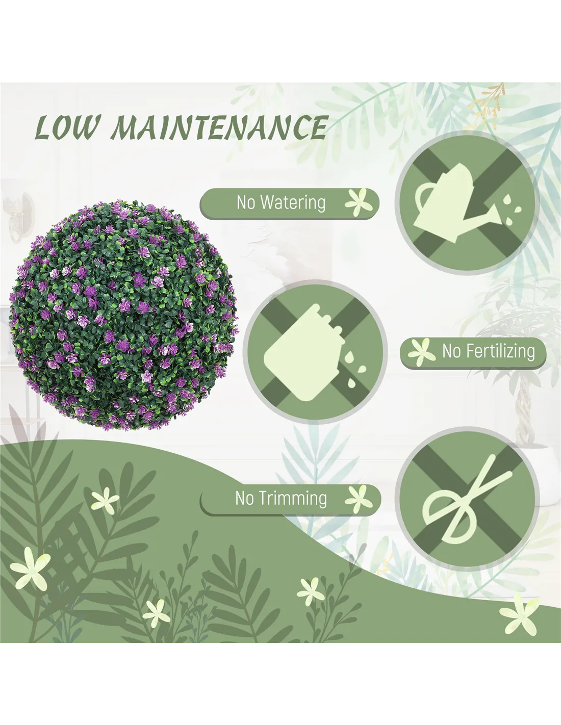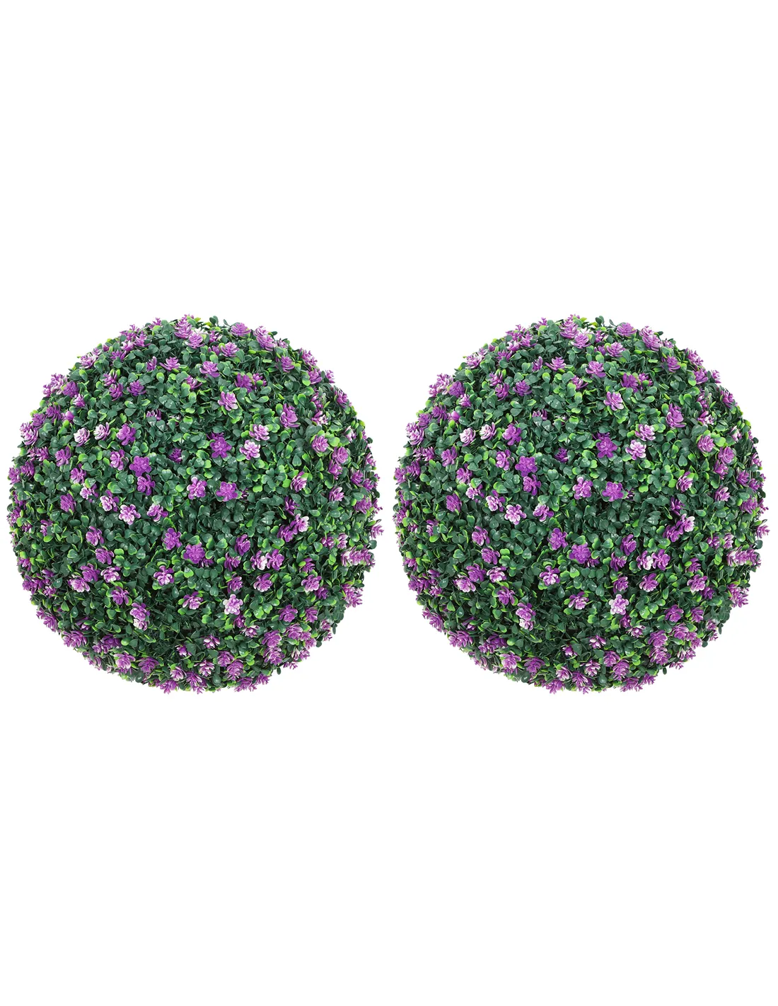 - A: The HOMCOM artificial boxwood balls are crafted from thick, durable PE plastic. They feature a realistic mix of light and dark green, with a purple tint.
