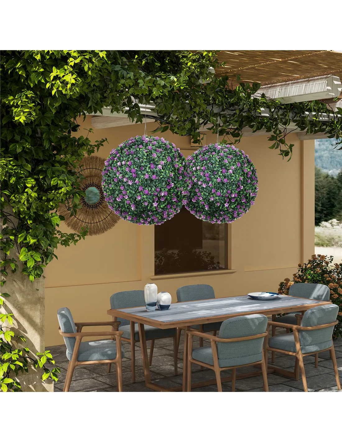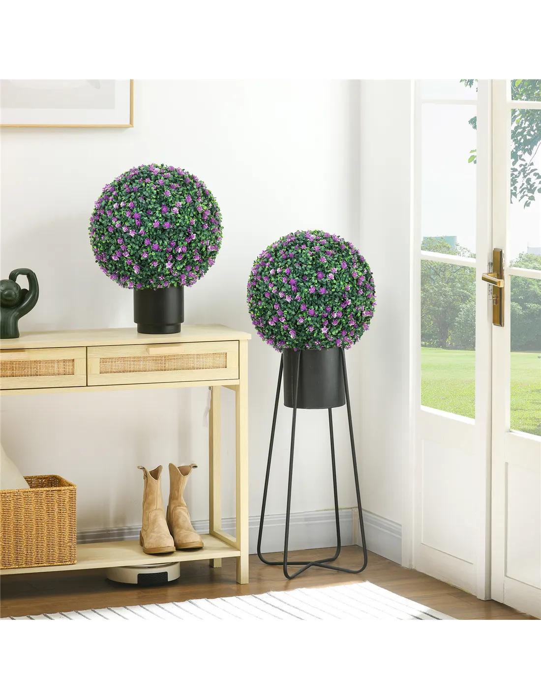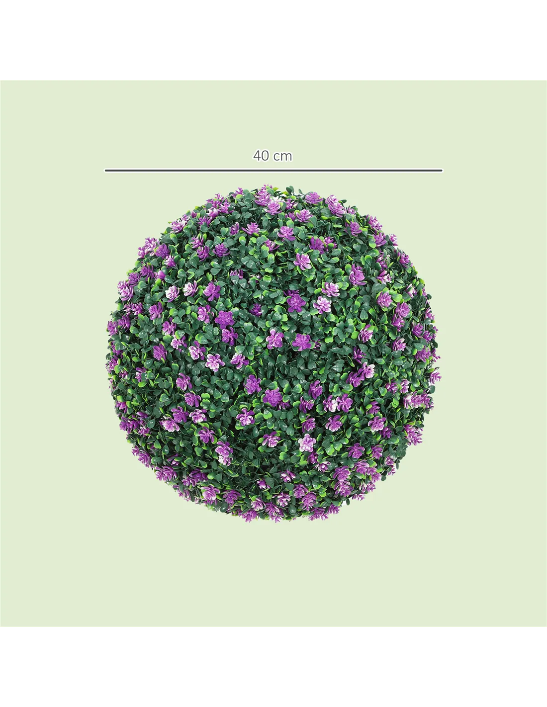 - A: Each boxwood ball has a purple colour, featuring a mix of light and dark green for a realistic appearance. Each ball measures 40 cm in overall diameter.