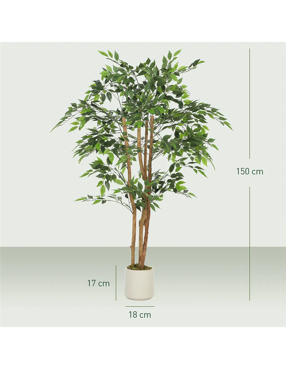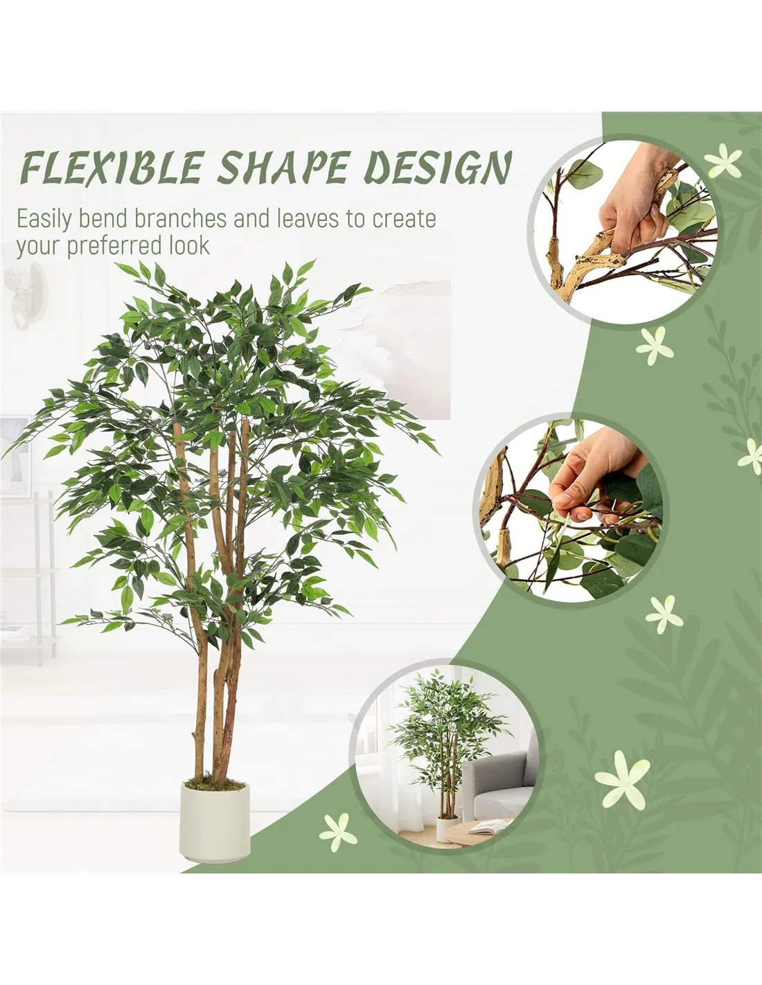 Bring lasting greenery into your UK home with the HOMCOM 150cm Artificial Ficus Tree. This fake potted plant offers the natural beauty of a ficus without any maintenance. It features realistic PEVA leaves and a solid wood trunk, providing lifelike detail. The tree arrives pre-potted in a stylish white planter, ready for instant display in any indoor space. Standing at 150cm, it fills bare corners, creating a balanced and refined aesthetic. You control the tree's overall shape by adjusting its bendable branches. A weighted base ensures stability, making this artificial ficus safe for households with children and pets. This decorative item suits living rooms, bedrooms, home offices, and entryways. Experience vibrant foliage all year round. Simply unpack and position the tree for immediate home enhancement.