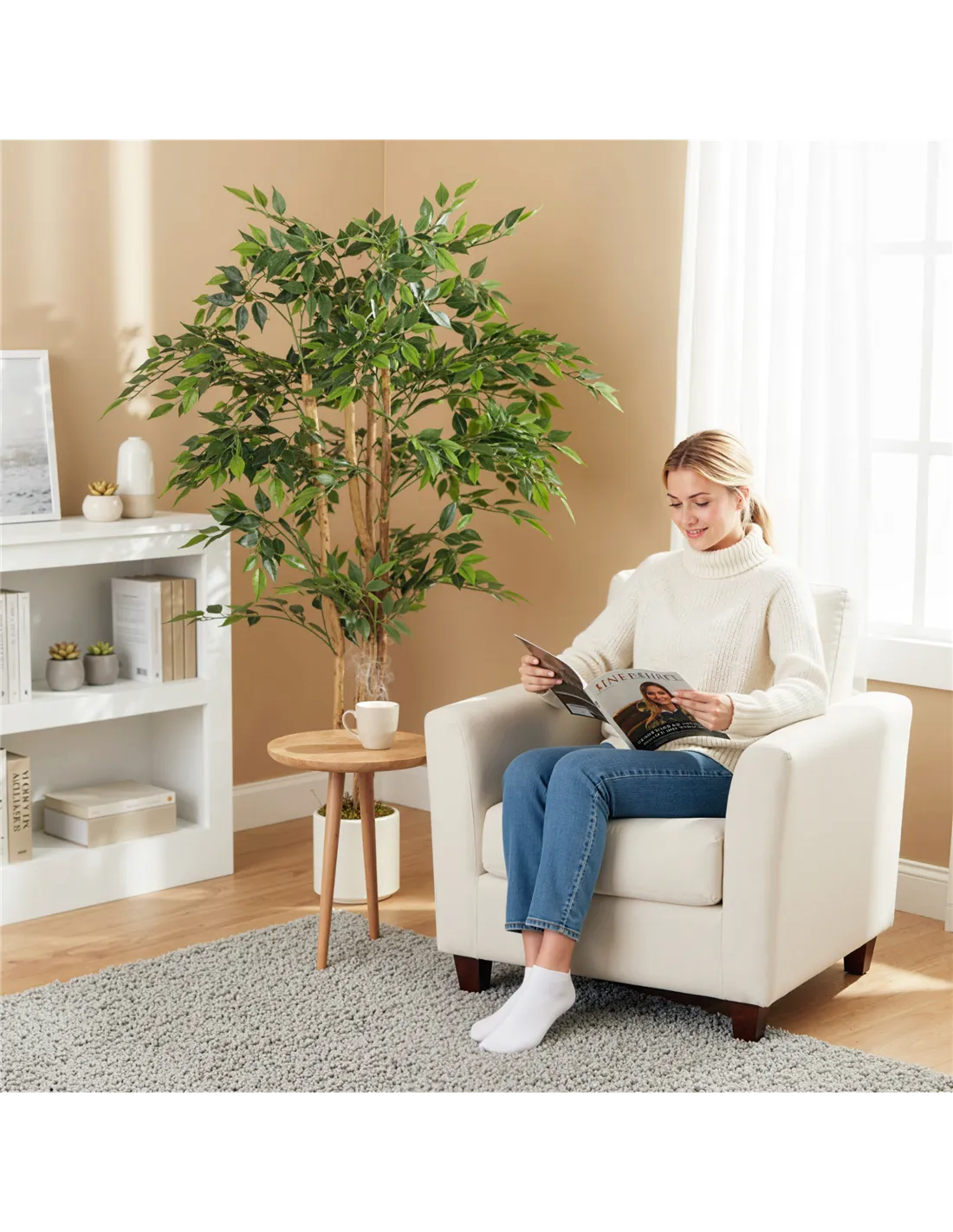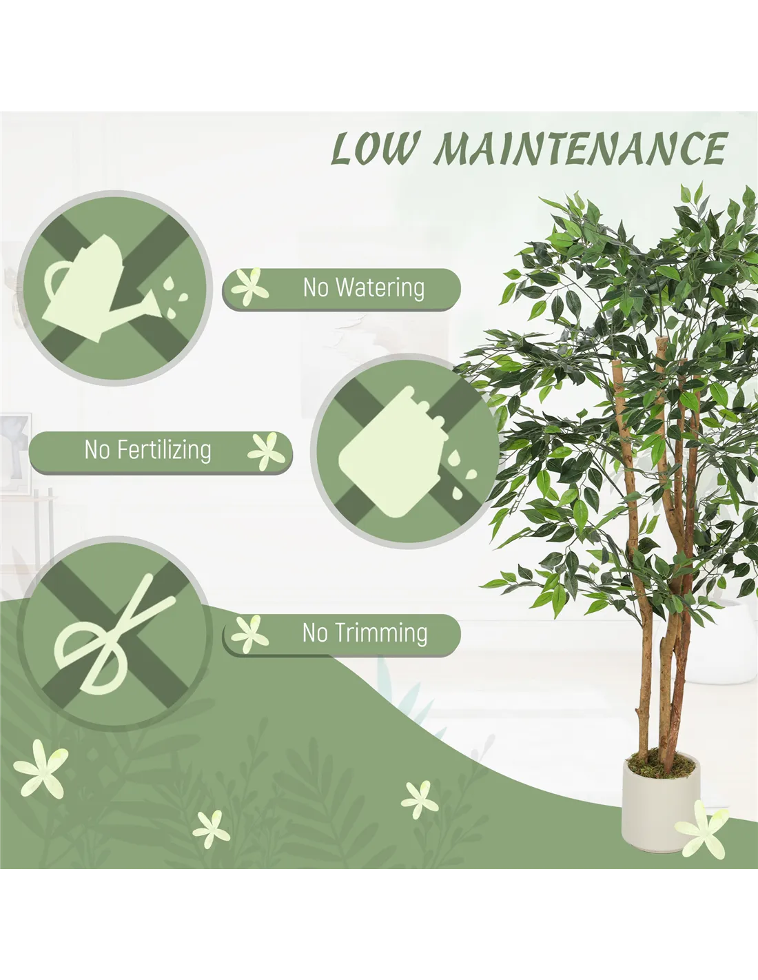 - A: This artificial ficus tree requires zero maintenance, providing everlasting greenery.