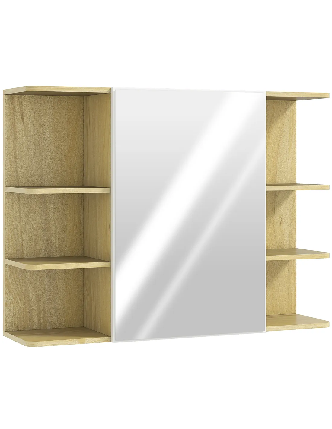 Enhance your bathroom with the HOMCOM Bathroom Mirror Cabinet, presented in a natural wood finish. This wall-mounted unit from FastDaddy provides a smart storage solution for UK homes, conserving precious floor space. A central mirror ensures effortless daily grooming. Behind the mirror door, a practical two-tier internal shelf conceals personal items, helping maintain a tidy bathroom aesthetic. Six open side compartments provide quick access to everyday essentials such as towels and soaps. Constructed from robust particleboard and finished with a scratch-resistant melamine surface, this cabinet offers exceptional durability and easy cleaning for busy family bathrooms. Its functional design, measuring 80W x 20D x 59H cm, delivers organised storage and practical utility.