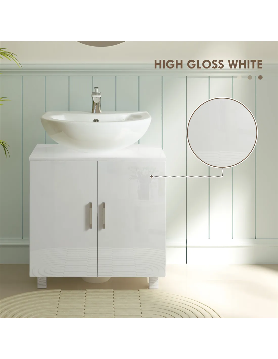Optimise your bathroom space with the HOMCOM Under Sink Cabinet. This high gloss white unit enhances any UK home, offering both style and practical storage. It fits basins up to 40W x 25D cm. A 20 x 20 cm U-shape cut-out ensures compatibility with pedestal sinks. The design also suits basins without pedestals, providing versatile fitting options. Inside, a middle shelf creates two distinct storage areas, perfect for cleaning supplies and toiletries. The durable painted MDF frame ensures longevity. Raised legs, 7.5 cm high, protect against water damage, maintaining the cabinet's integrity. Foot pads safeguard your flooring. An anti-tipping design provides essential safety in your home. This 60W x 35D x 60H cm cabinet offers robust storage, supporting 50 kg overall.