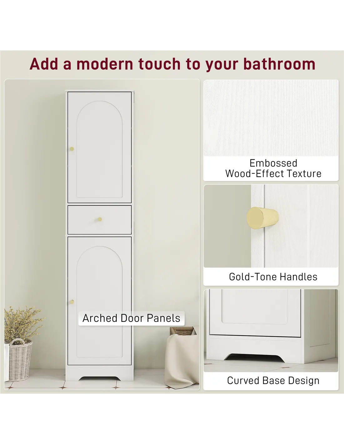 Elevate your bathroom organisation with the HOMCOM Tall Bathroom Cabinet. This elegant, white storage unit provides practical solutions for keeping your space tidy. Designed for UK homes, its tall and slim profile (40W x 29.5D x 170H cm) integrates seamlessly into compact bathrooms, maximising vertical storage without taking up excess floor area. You get two spacious cupboards and a central drawer, offering dedicated spots for toiletries, towels, and daily essentials. The top cupboard features a three-level adjustable shelf, adapting to your specific storage requirements. Finished with an embossed wood texture, sophisticated arched doors, and refined gold-tone knobs, this cabinet brings both style and robust functionality to your home. An anti-tip kit ensures family safety, providing peace of mind. The melamine-faced surface offers scratch resistance and simplifies cleaning, making maintenance effortless.