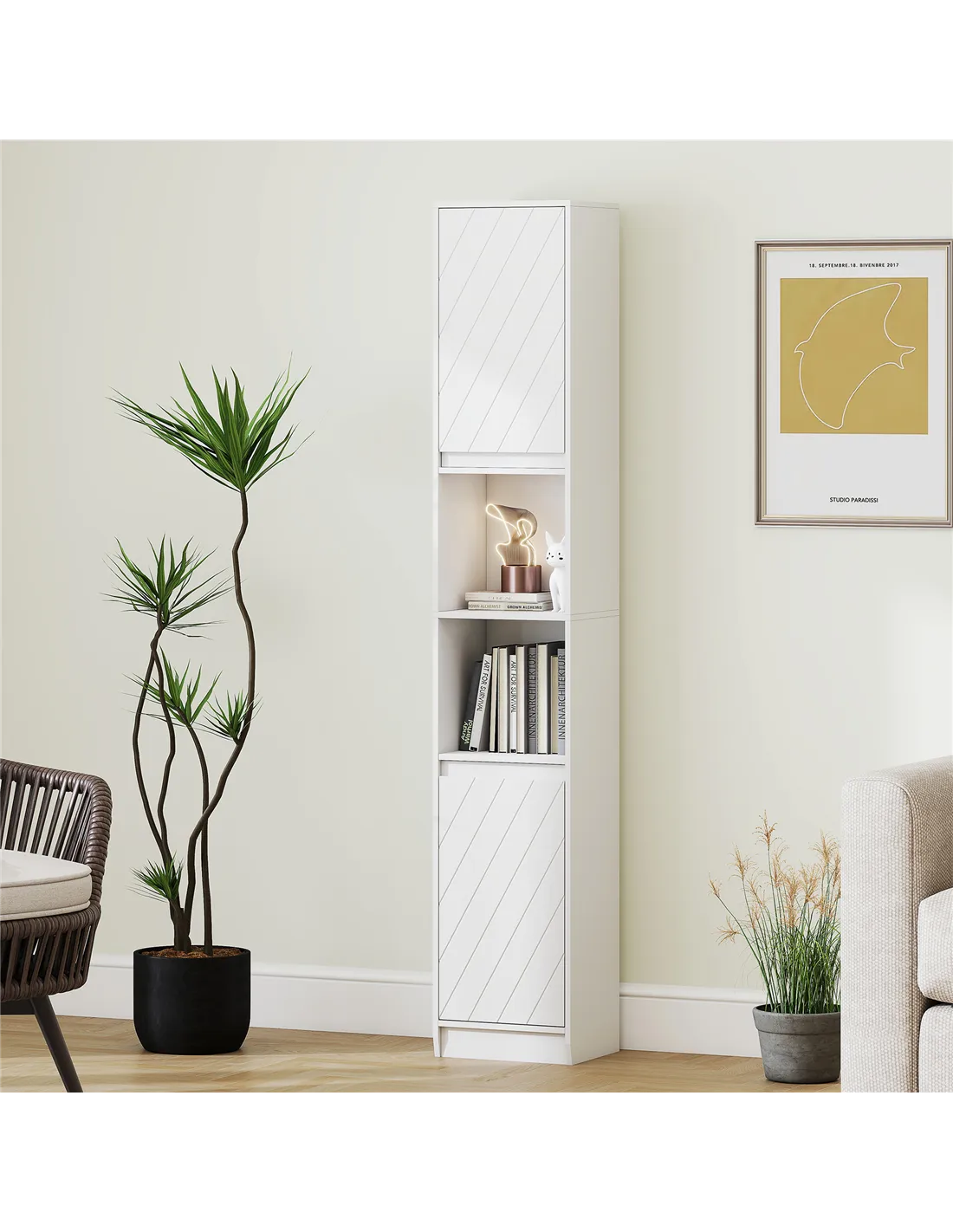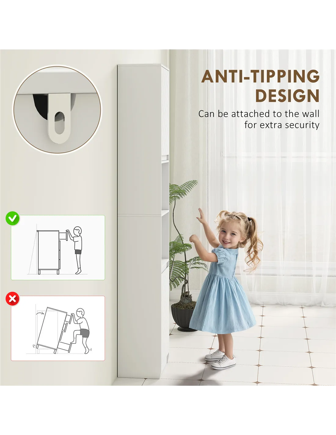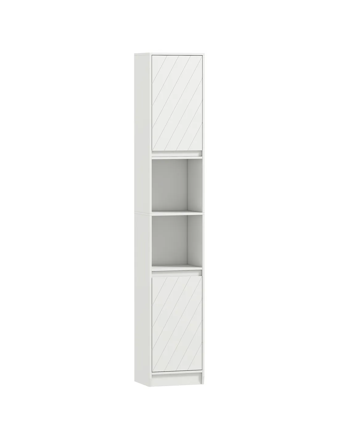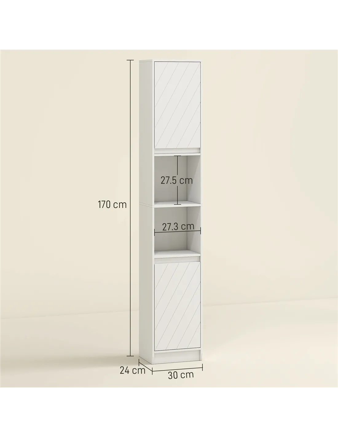 Do you need to maximise space in your bathroom? The HOMCOM Narrow Bathroom Cabinet provides an ideal solution for compact living. This slim bathroom storage unit fits perfectly into tight areas, measuring just 30 cm wide, 24 cm deep, and 170 cm high. It offers versatile storage with two spacious cupboards and two open compartments, perfect for towels, toiletries, and other essentials. Its freestanding design allows easy placement in any part of your bathroom. Crafted from a durable blend of MDF and particle board, this white storage cupboard ensures reliability for daily use. Adjustable shelves provide flexible organisation for various item sizes. Anti-tipping straps enhance safety, making it suitable for family homes. This unit helps you maintain an organised, clutter-free bathroom, optimising every inch of your available space. Assembly is required for this practical addition.