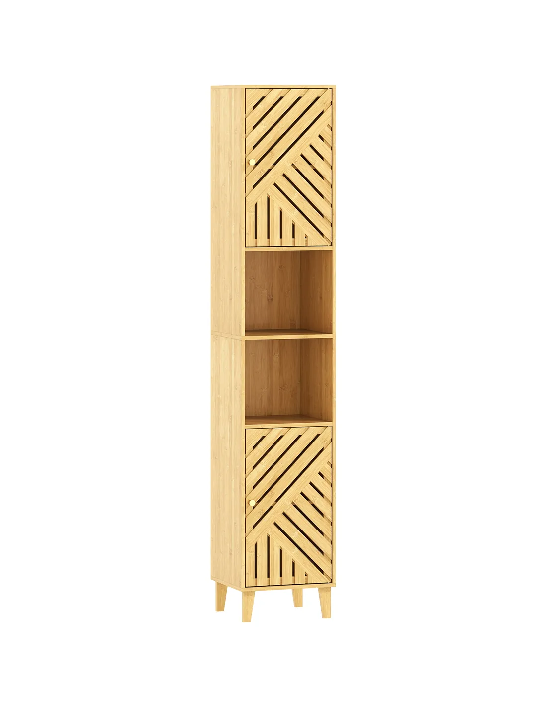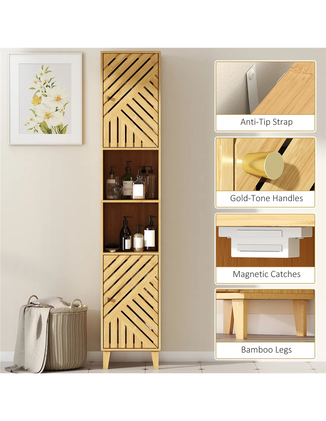 Upgrade your bathroom with the HOMCOM Multi-Storage Bamboo Door Bathroom Cabinet. This tall, slim unit provides extensive storage for your UK home. It features upper and lower cupboards, alongside two open middle shelves. Organise towels, toiletries, and cleaning products effortlessly. Inside the cupboards, two shelves adjust to suit your exact storage requirements. Bamboo door panels and legs offer a natural, modern aesthetic. The doors include cut-out panels, ensuring constant aeration for stored items. This cabinet is designed to maximise space in smaller bathrooms. Secure it safely to a wall using the included anti-tipping straps. The natural wood finish complements any decor. This HOMCOM cabinet combines style, practicality, and safety, making it an essential addition to your bathroom. It delivers optimal storage while enhancing your home's natural style.