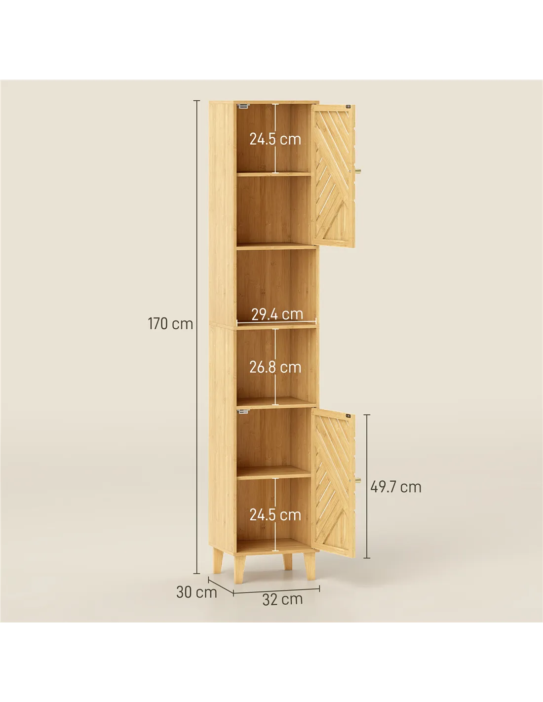 - A: The overall dimensions of this tall bathroom cabinet are 32W x 30D x 170H cm. Its slim design suits smaller bathroom spaces.