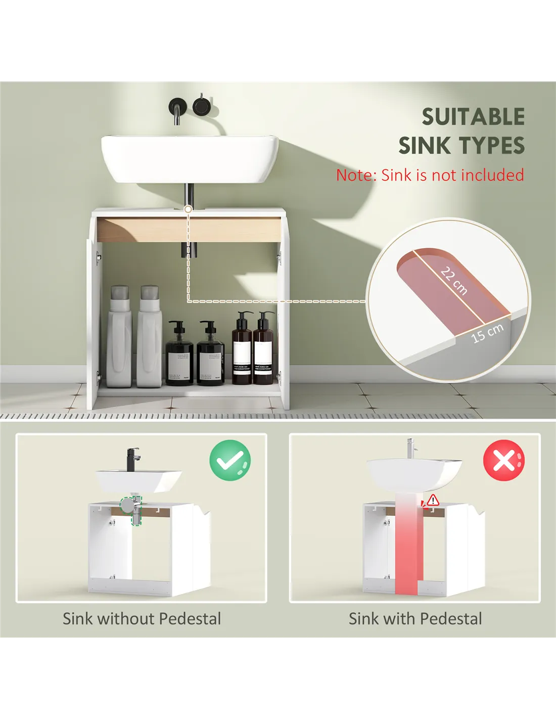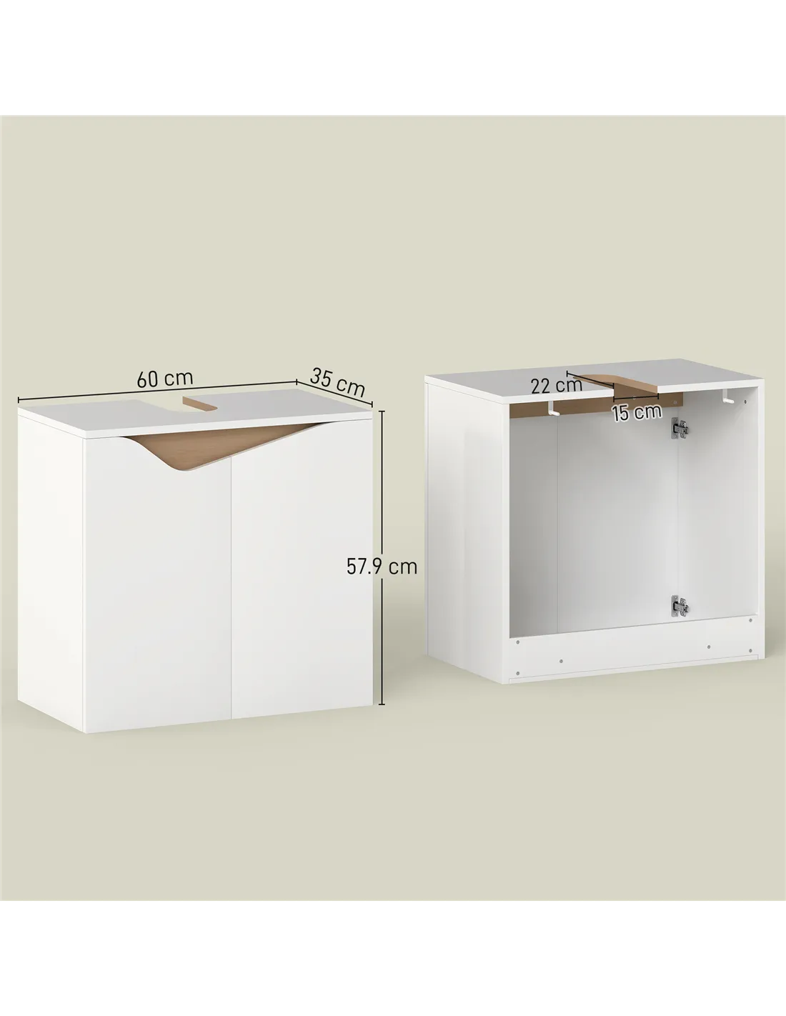- A: This cabinet fits wall-mounted washbasins without a pedestal. It has a 15W x 22D cm U-shaped cut-out. It suits basins up to 60W x 35D cm.