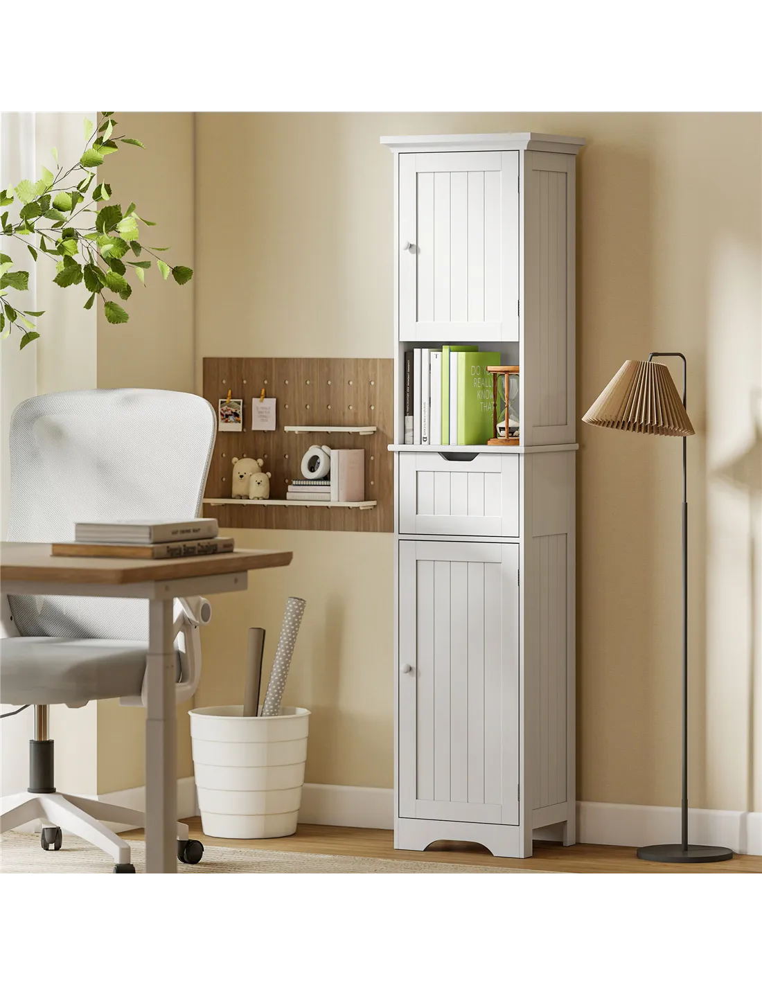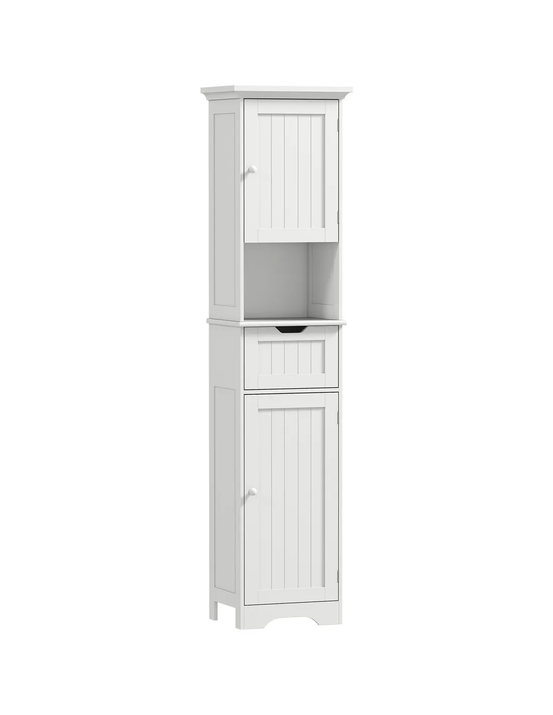 - Tall and slim to fit into smaller spaces. Fresh white design looks great in different bathroom styles