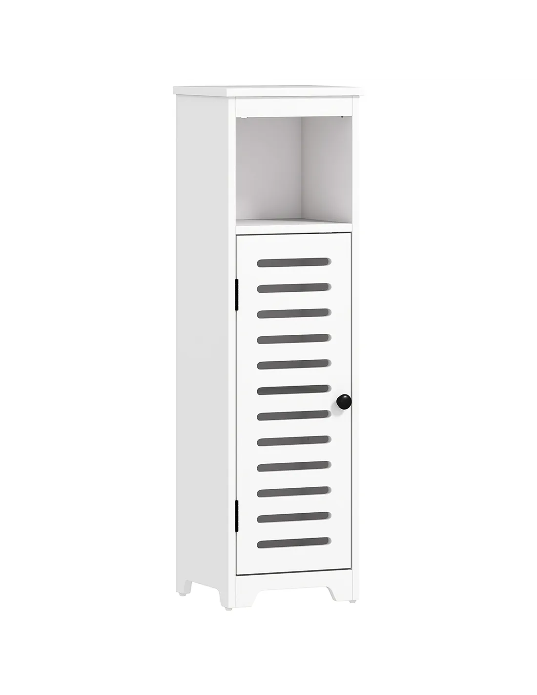 Achieve a clutter-free bathroom with the HOMCOM Floor Cabinet from FastDaddy. This storage unit, measuring 22W x 20D x 75H cm, offers a practical solution for organising your essentials. It features a louvered door cupboard, an accessible open shelf, and a top surface, providing ample space for toiletries, towels, and other items. The internal three-level adjustable shelf allows customisation for taller objects. Constructed from durable MDF, this cabinet offers stability and includes an anti-tipping device for enhanced safety. Its sleek white finish, combined with a black metal handle, delivers a modern aesthetic. This slim design unit fits small spaces effectively, suitable for bathrooms, bedrooms, kitchens, or hallways.