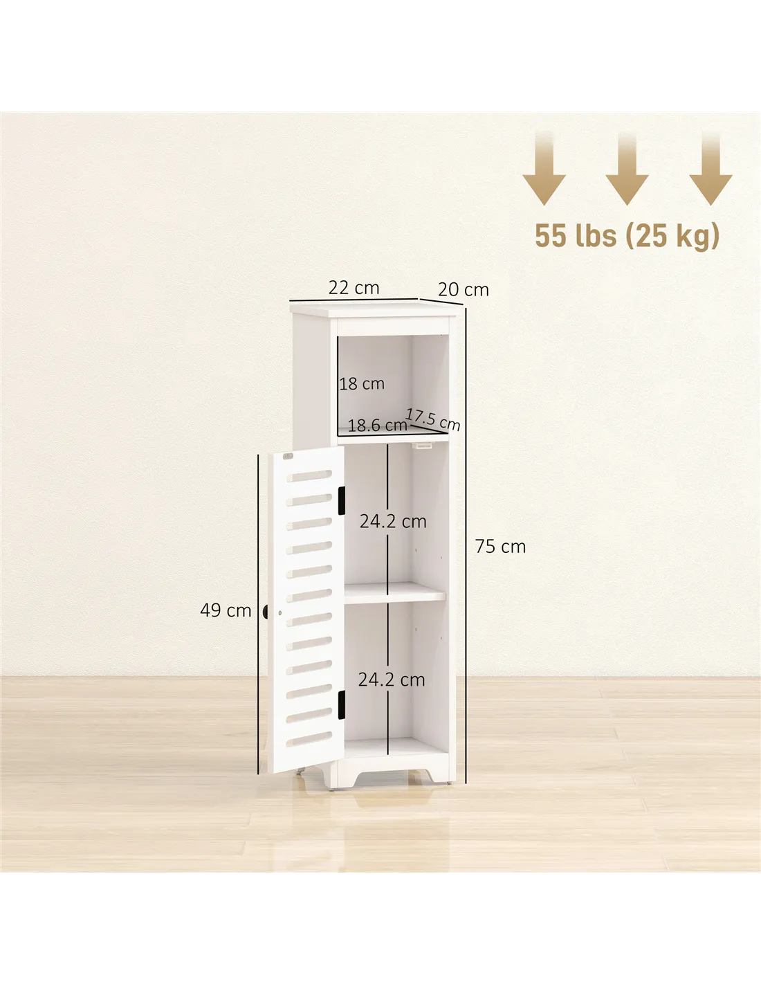 HOMCOM Bathroom Floor Cabinet, Bathroom Storage Unit with Louvered Door, Open Shelf, Adjustable Shelf, White, 22 x 20 x 75 cm
