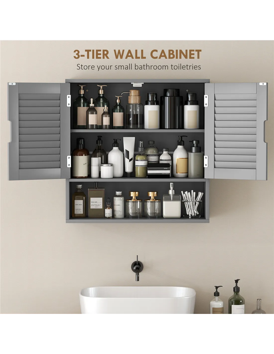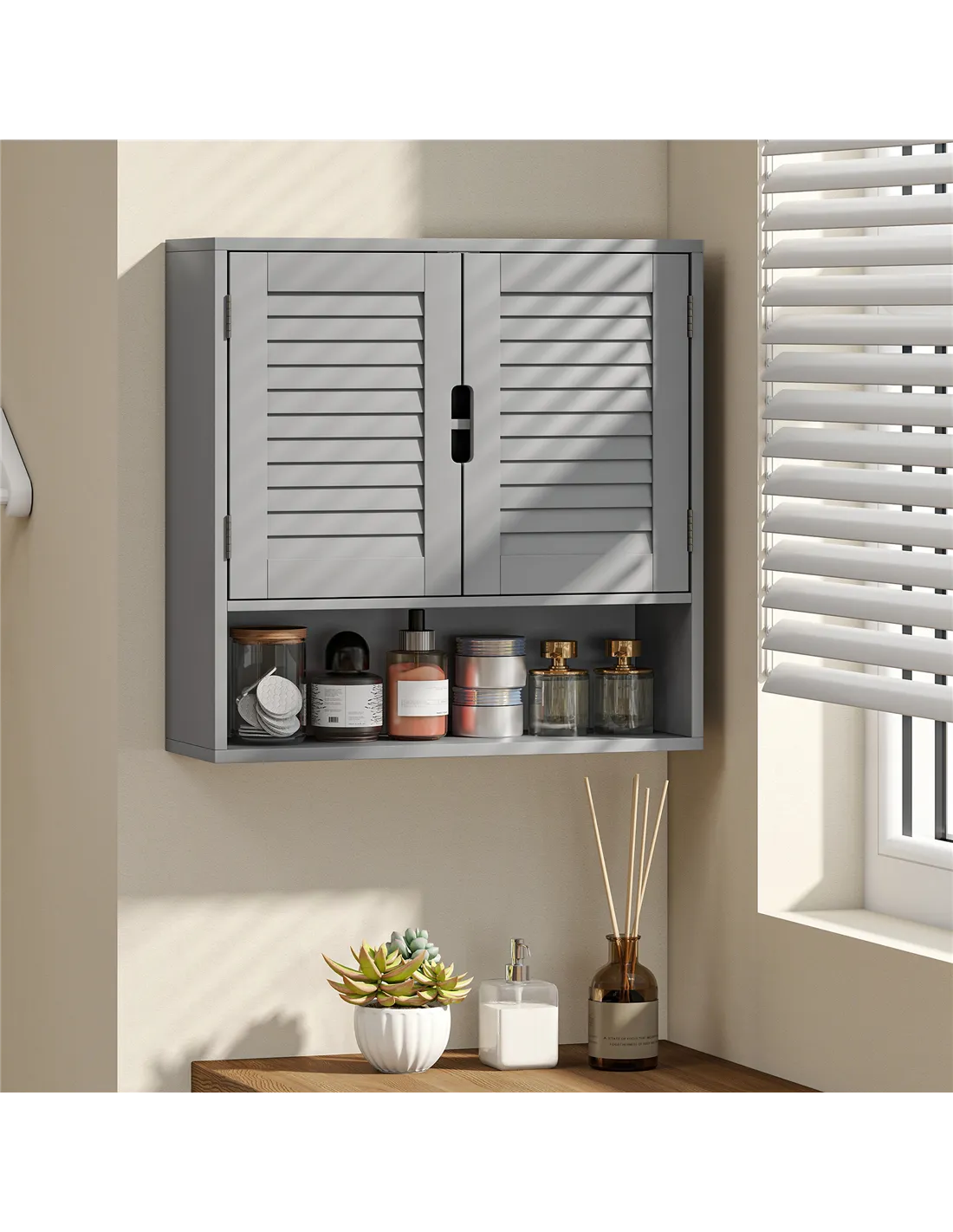 - Stylish grey finish and louvered door elevate your bathroom decor