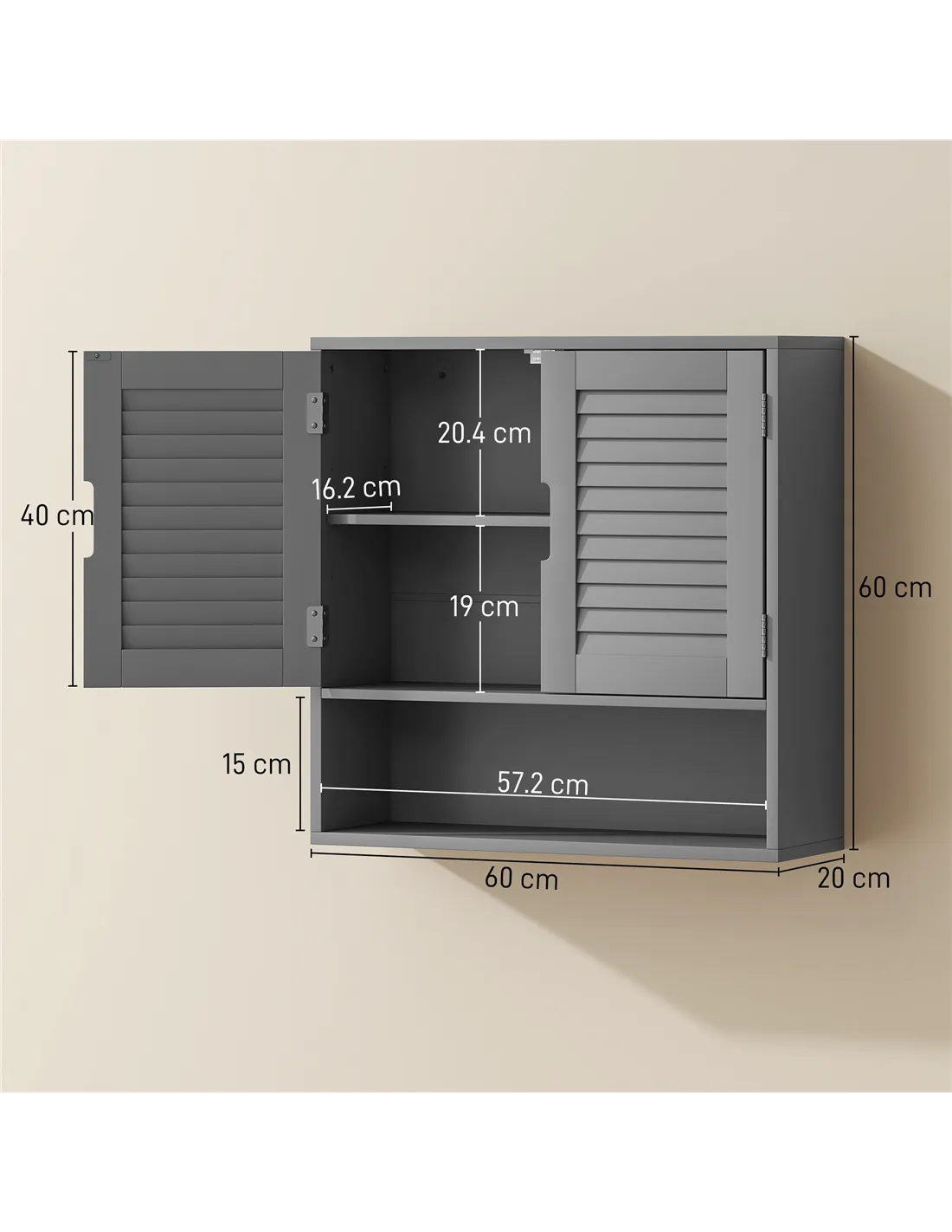 - A: The overall dimensions of this wall-mounted cabinet are 60W x 20D x 60H cm.