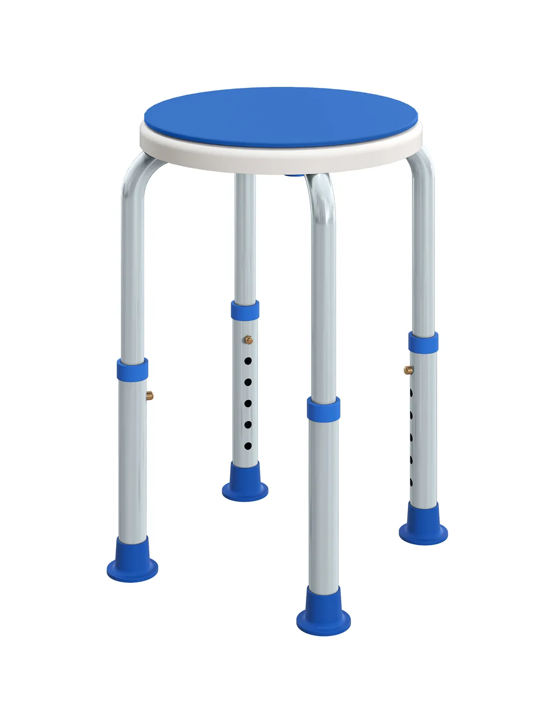 The HOMCOM 360° Swivel Shower Chair provides essential support for bathing. This height adjustable aluminium shower stool is designed for disabled individuals, the elderly, or anyone requiring additional assistance daily. Its robust aluminium frame resists water damage, ensuring long-term stability and balance. The chair safely supports users up to 135kg. Adjust the seat height to one of six comfortable levels. A full 360-degree rotating seat allows easy movement from side to side within the shower or bath. Non-slip feet provide critical safety on wet surfaces. Finished in blue and white, this lightweight and durable stool offers practical independence. Constructed from aluminium, PP plastic, and TPR rubber, it measures Φ33 x 35.5-48.5 cm. This CE certified shower chair weighs just 1.65 kg.