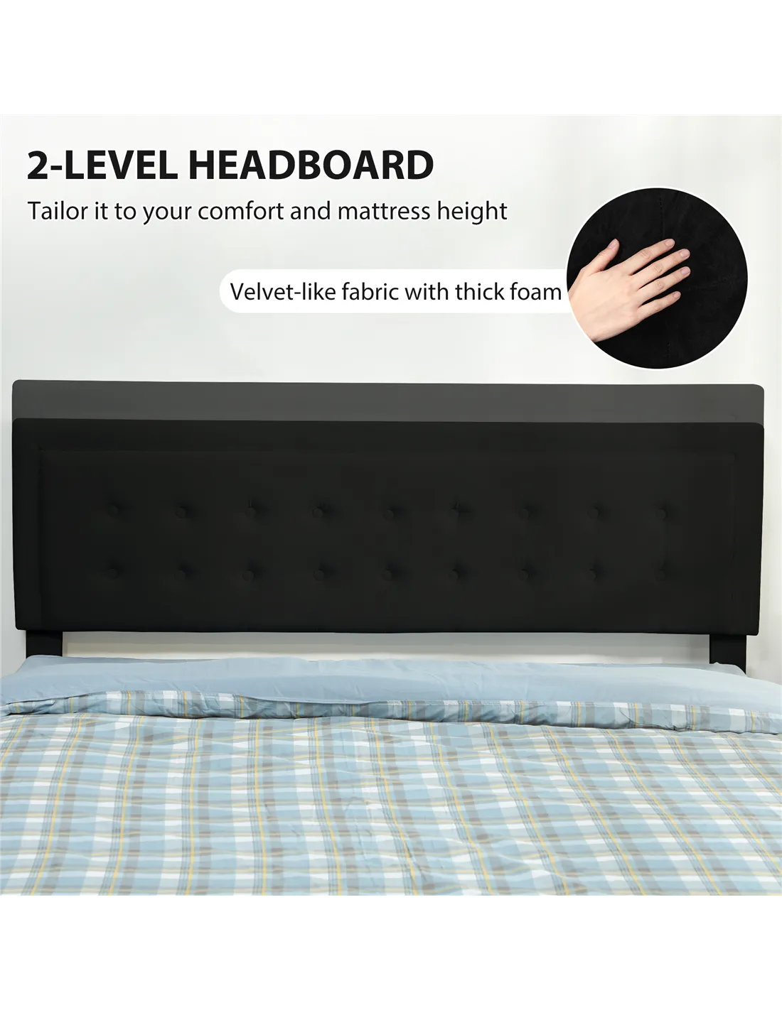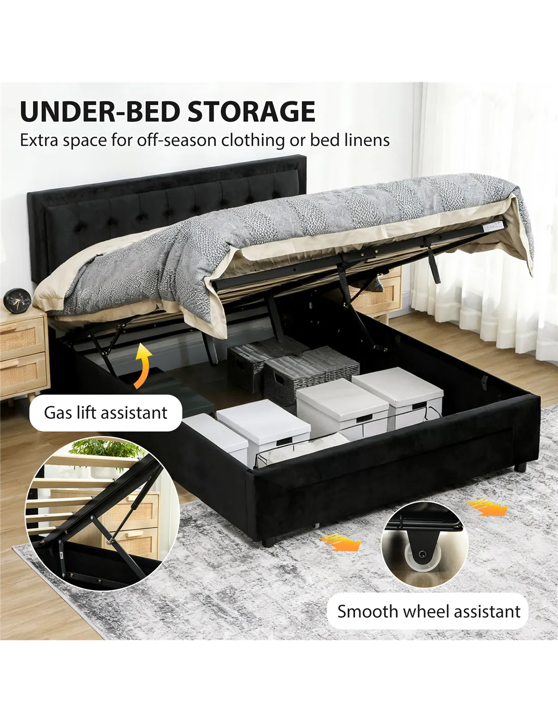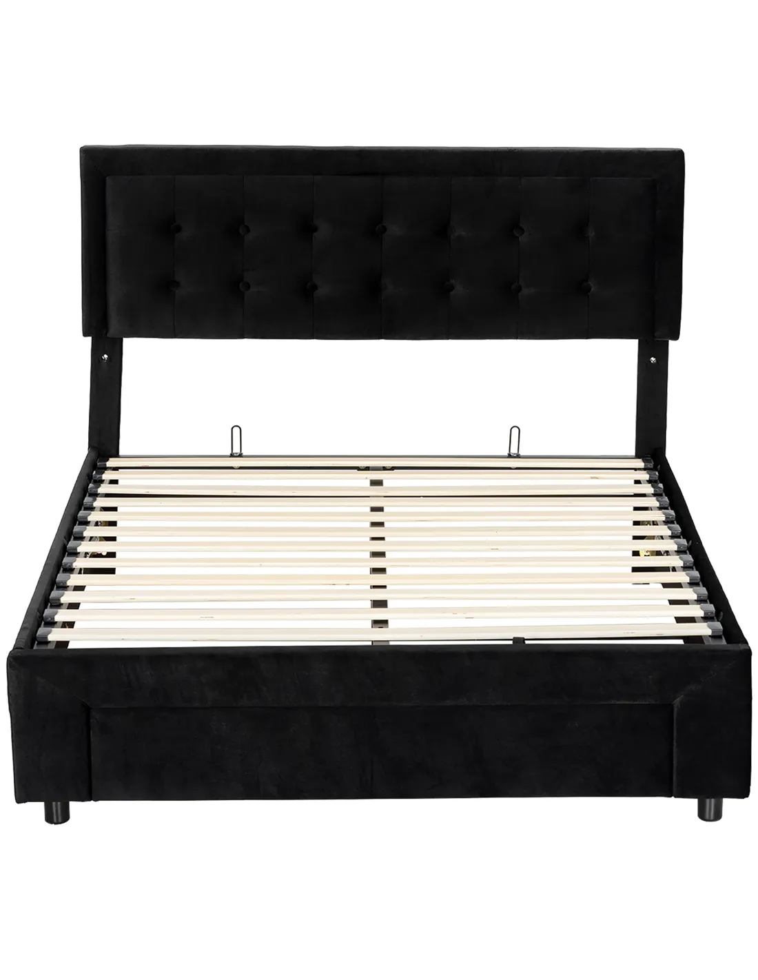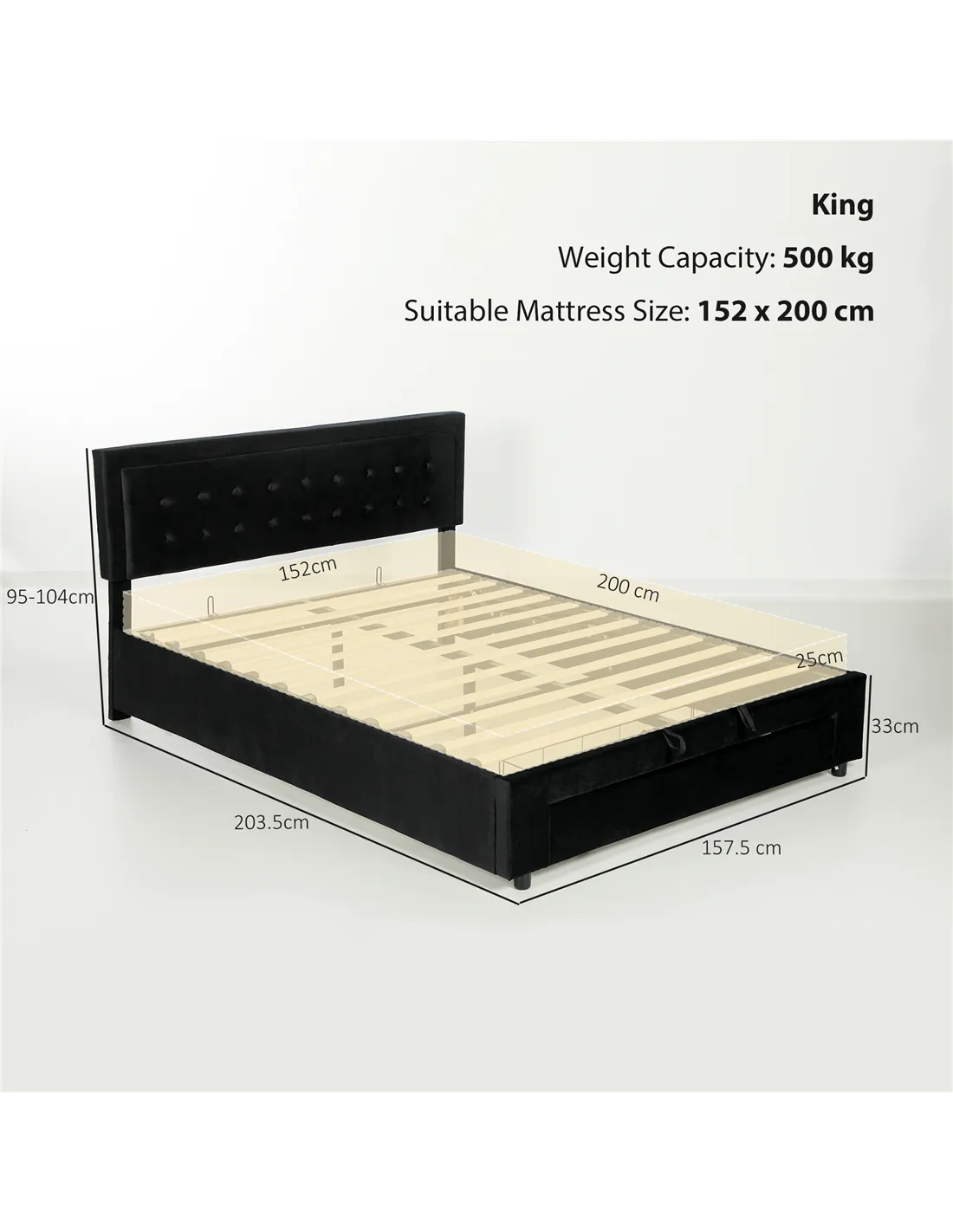 The HOMCOM King Size Ottoman Bed Frame in black transforms your bedroom with superior storage. This bed frame provides a spacious 157.5 x 203.5cm internal area, ideal for tidying away garments and accessories. A robust gas lifting mechanism ensures effortless access to this under-bed space, allowing you to lift the base smoothly with ease. Complementing this, a wheeled front drawer offers quick access for smaller items, enhancing your organisation. The bed frame supports your mattress on solid wooden slats, ensuring stability and a level sleeping surface. Crafted for both comfort and practicality, this king size bed creates a clutter-free environment. Its velvet-feel headboard adjusts to two levels, adding comfort. The frame supports a substantial 500 kg, providing long-lasting reliability. Enjoy a structured, restful sleep experience.