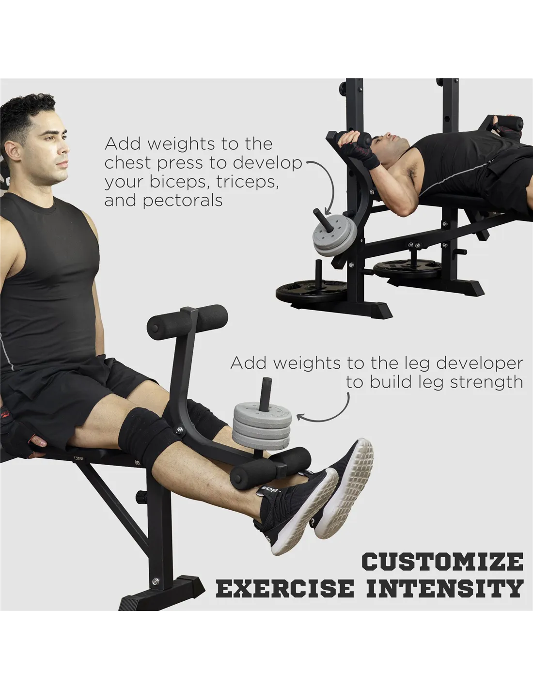 Transform your home gym with the HOMCOM Adjustable Weight Bench. This multi-station exercise bench offers a full-body strength training solution for UK residents. Its all-in-one design targets numerous muscle groups efficiently. The bench features an incline press, squat rack, leg developer, butterfly curl, and a high pulley system for diverse workouts. A robust steel frame ensures superior strength and stability, supporting up to 300 kg. You get a comfortable workout experience thanks to the padded seat and back, crafted from sweat and odour-free fabric. Conveniently store your 1-inch barbell plates on the integrated posts. This HOMCOM bench provides comprehensive fitness capacity within your limited space, delivering a complete workout experience at home.