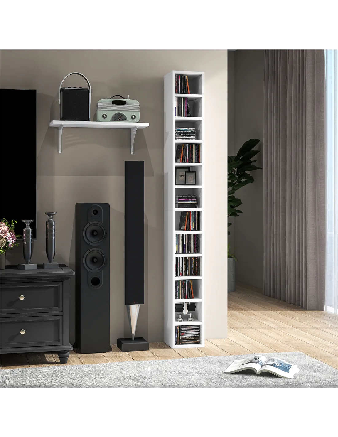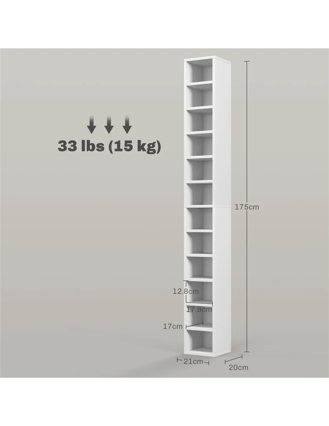 The HOMCOM 204 CD Tall Narrow Media Storage Tower in White efficiently organises your media collection. This elegant, space-saving unit, designed for UK homes, provides extensive storage for up to 204 CDs across its 12 tiers. Constructed from durable particleboard and MDF, it offers a robust solution for decluttering your living space. Its slender profile, measuring 21L x 20W x 175Hcm, fits comfortably into narrow areas without compromising capacity. An essential anti-tipping design ensures the tower securely fixes to your wall, promoting household safety. This versatile storage piece supports a maximum load of 15kg, making it suitable for a substantial media library. Assemble this unit to transform your home organisation; delivery terms are available beneath the price on FastDaddy. Enjoy a tidier, more functional environment with this dedicated media storage solution.