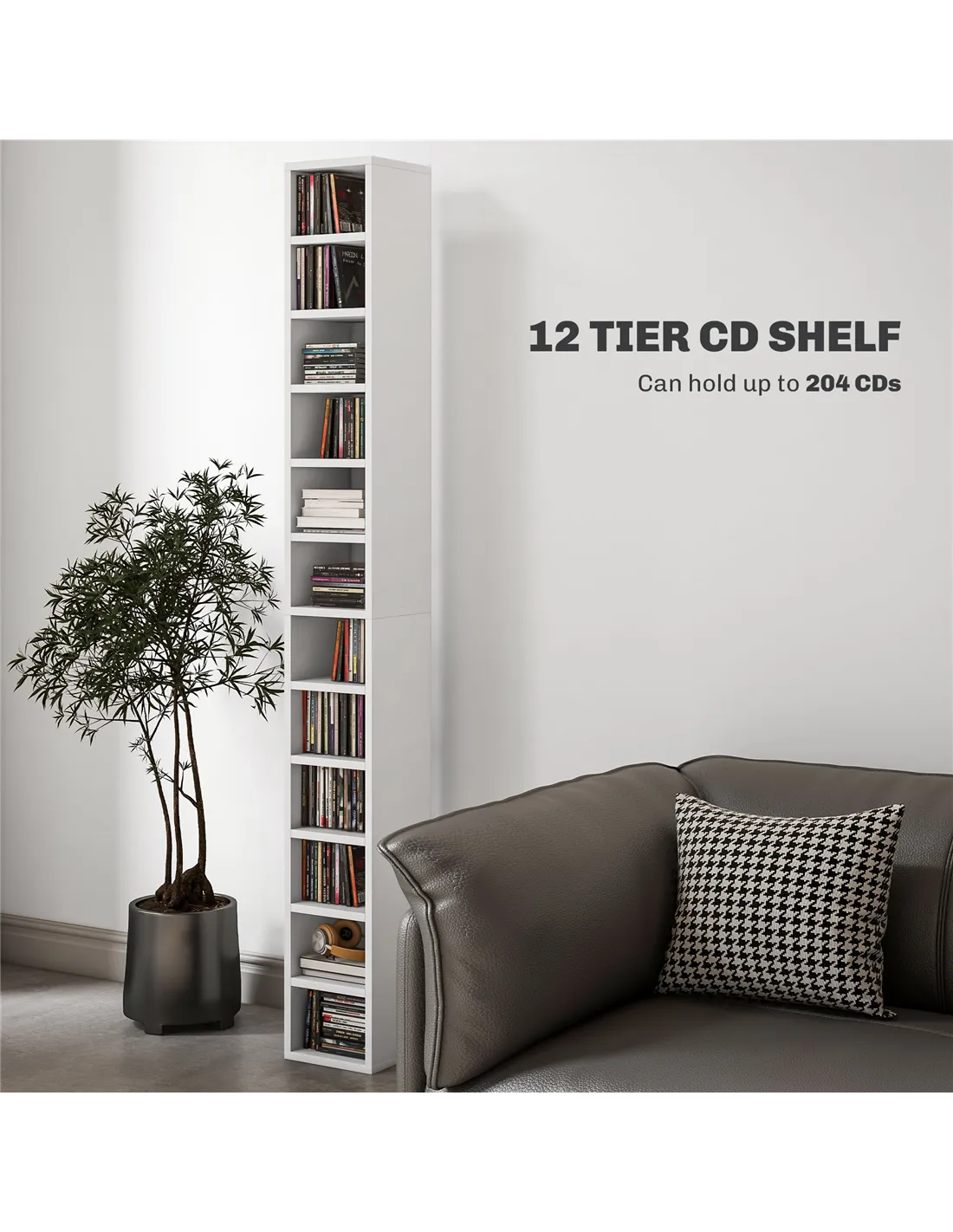 Q: How many CDs can the HOMCOM 204 CD Tall Narrow Media Storage Tower hold? A: This media storage tower is designed to hold up to 204 CDs across its 12 tiers.