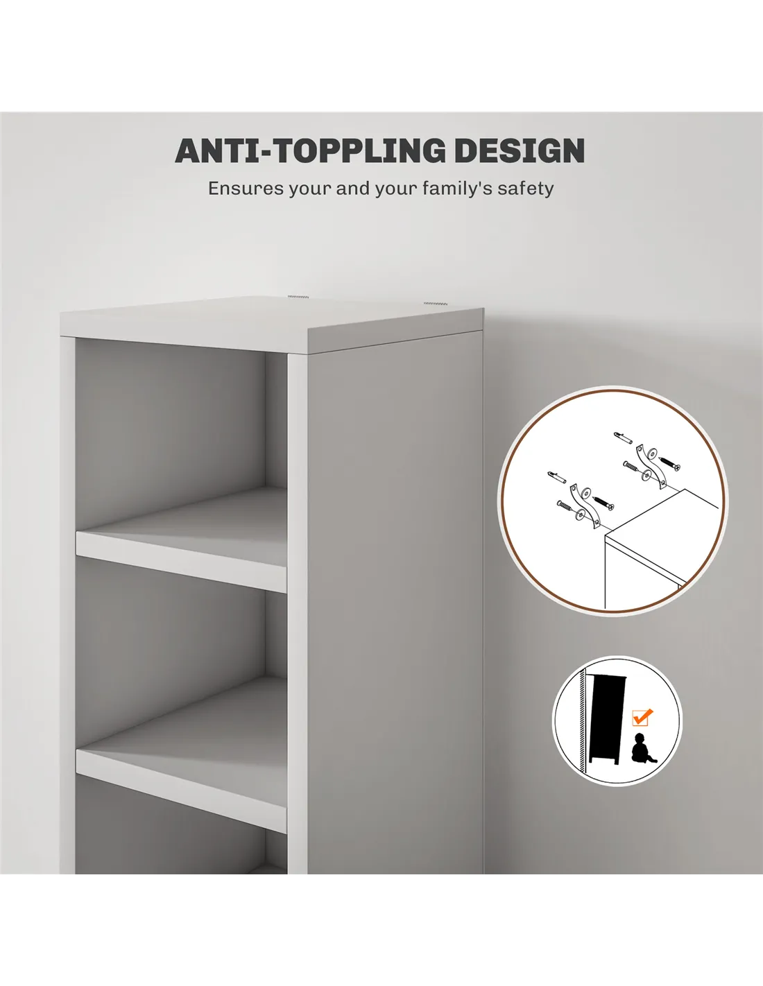 Q: What safety features does this media tower include? A: The tower includes an anti-tipping design, allowing you to safely fix it to a wall.