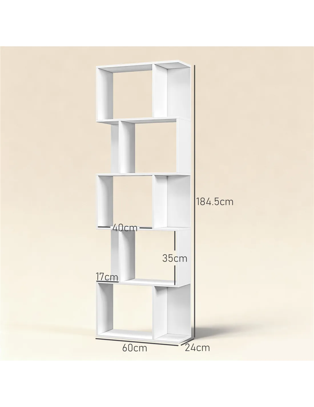 Redefine your interior design with the HOMCOM S-Shaped Bookcase, a striking white wooden bookshelf designed for contemporary British homes and offices. This freestanding 5-tier storage unit offers ample space for books, cherished photos, and decorative collectables. Its distinctive S-shape provides a modern aesthetic while delivering functional versatility. Position it against a wall as a display stand or utilise its open-back design as an elegant room divider. Constructed from solid particle board, this HOMCOM unit ensures lasting stability. Each of its five shelves supports a weight capacity of 20kg, providing secure storage. This adaptable display rack, measuring 60L x 24W x 184.5H cm, merges style with practicality, offering a sophisticated storage solution for your living space or dedicated home office.