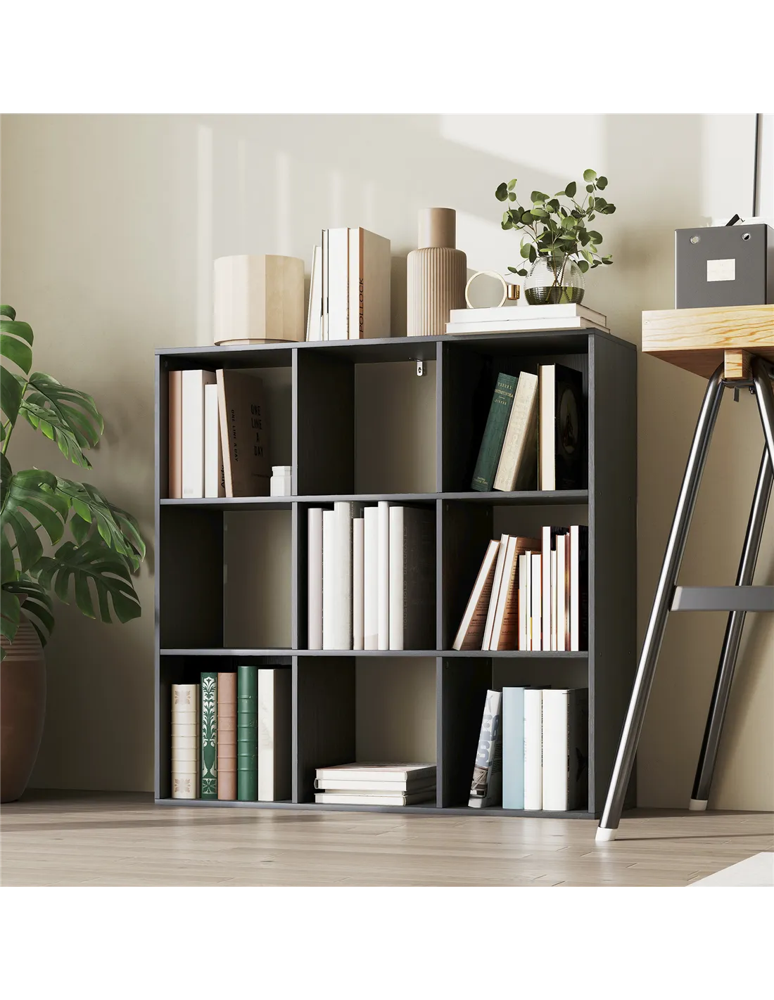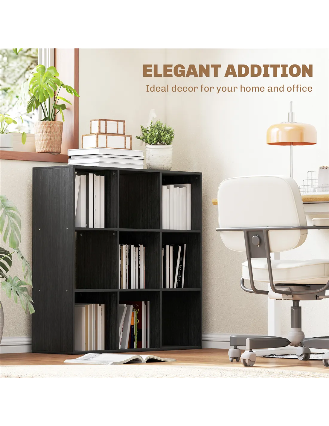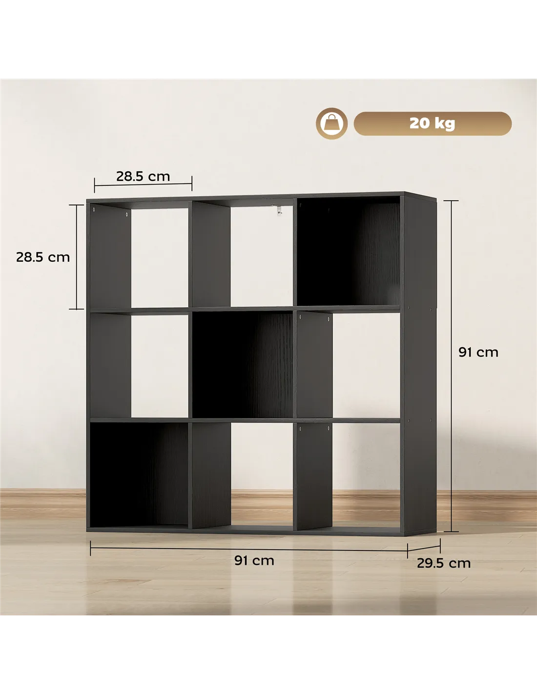 The HOMCOM Nine-Cube Storage Shelf in Black provides practical storage and display for any UK home or office. Crafted from sturdy particle board with a smooth veneer finish, this unit ensures durability for daily use. Its design offers nine open compartments. Each cube provides 28.5W x 29.5D x 28.5H cm of space for books or décor. The overall dimensions are 91W x 29.5D x 91H cm. It holds a total weight of 20 kg, with each compartment supporting 10 kg. A flat base ensures steady balance. An anti-tip kit is included for wall security. This versatile black unit suits various interior styles, optimising your space with functional design.