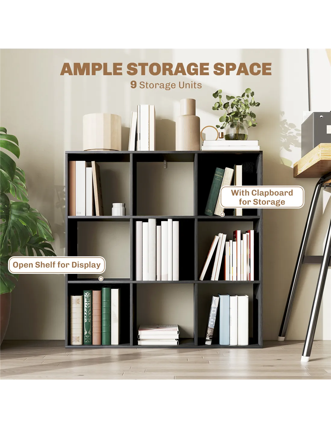 - Nine open compartments offer plenty of storage and display room