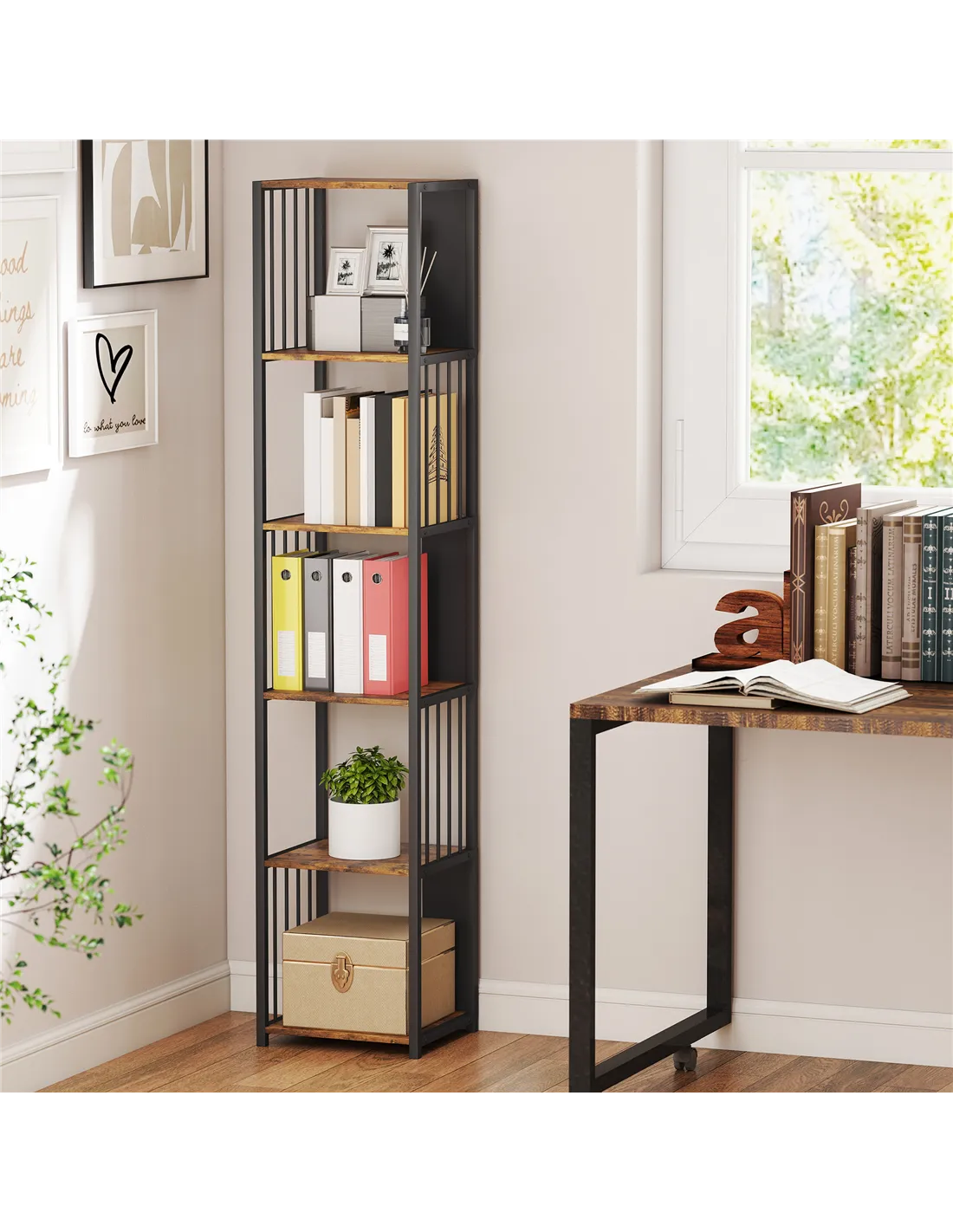 Enhance your British home with the HOMCOM 5-Tier Bookshelf, a robust storage solution designed for UK living spaces. This rustic brown bookcase features a sleek black steel frame, offering a modern, minimalist aesthetic. It integrates effortlessly into your existing decor. Crafted from durable melamine-faced MDF and robust steel pipes, this unit ensures lasting stability. Anti-tip straps provide peace of mind, securing the bookshelf safely within your home. Its five open tiers deliver ample space for organising your books, displaying cherished photographs, or showcasing decorative plants. Each shelf holds up to 10 kg, with a total maximum load of 60 kg. Measuring 33.5W x 30D x 165H cm, this bookshelf helps you maintain a clutter-free, functional environment. It provides a practical, stylish addition to any room, meeting your storage needs efficiently.