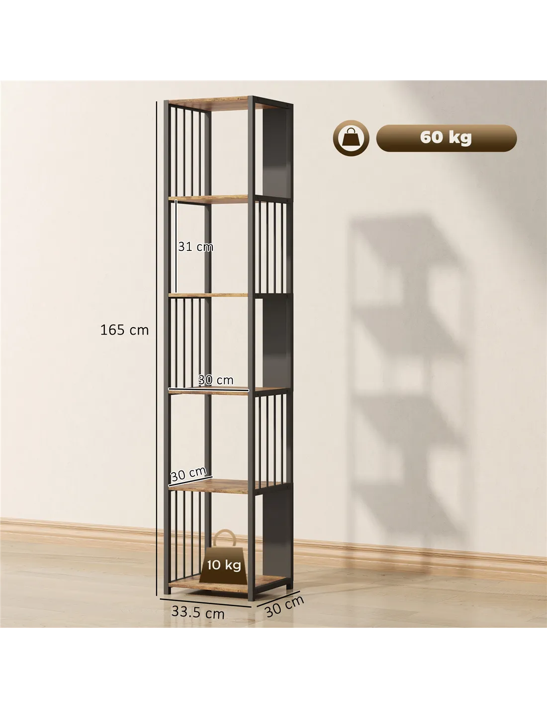 - A: The bookshelf measures 33.5W x 30D x 165H cm. Each shelf has dimensions of 30W x 30D cm and a height of 31 cm.
