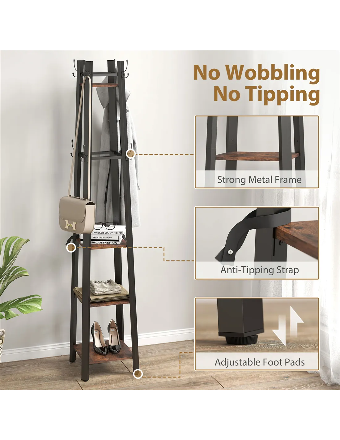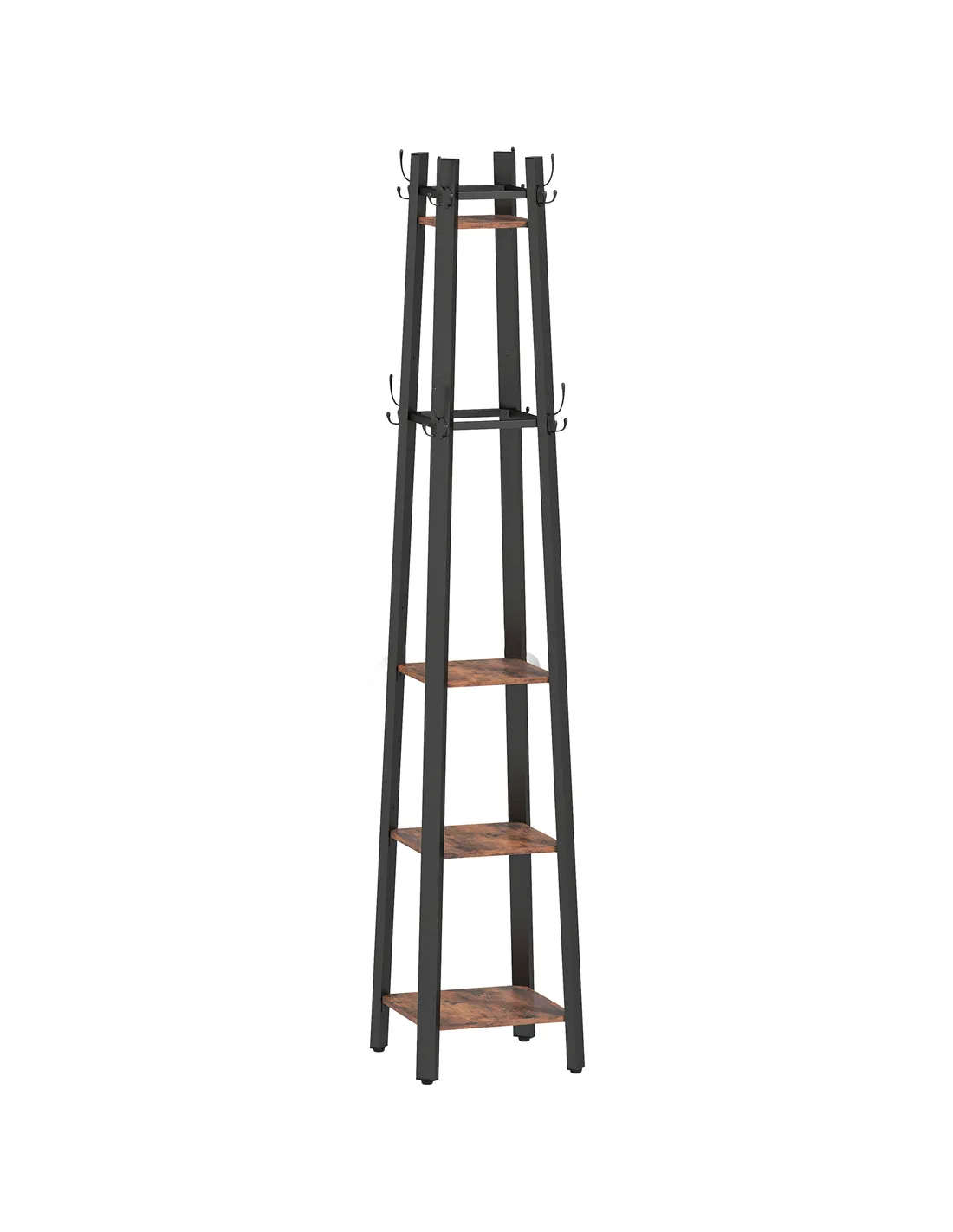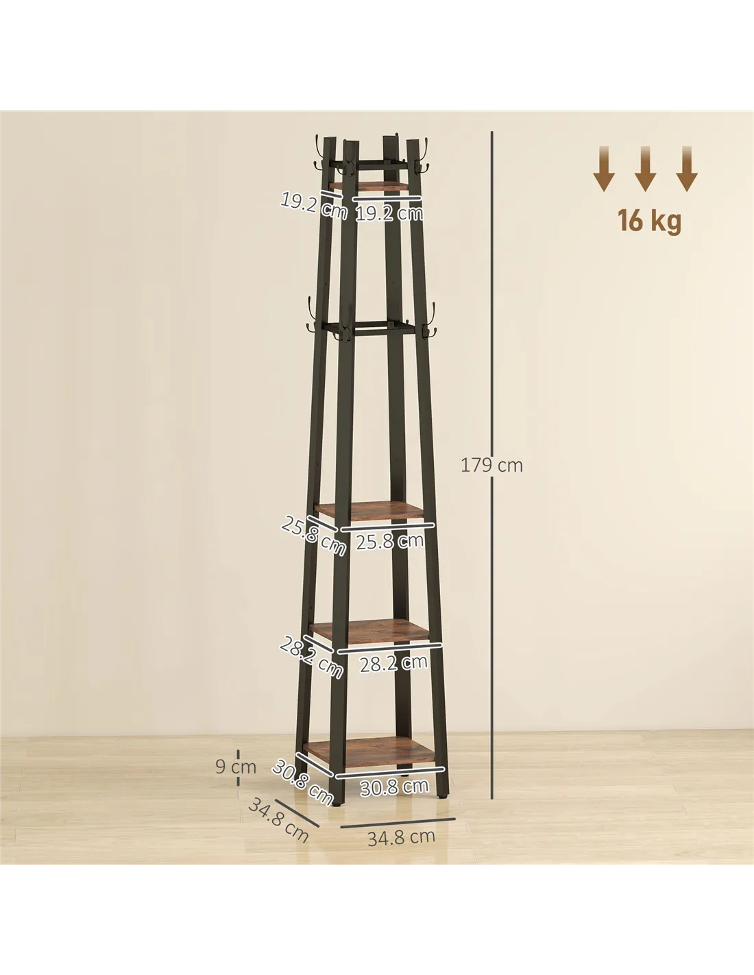 HOMCOM Industrial-Style Four Shelf Coat Stand - Brown/Black