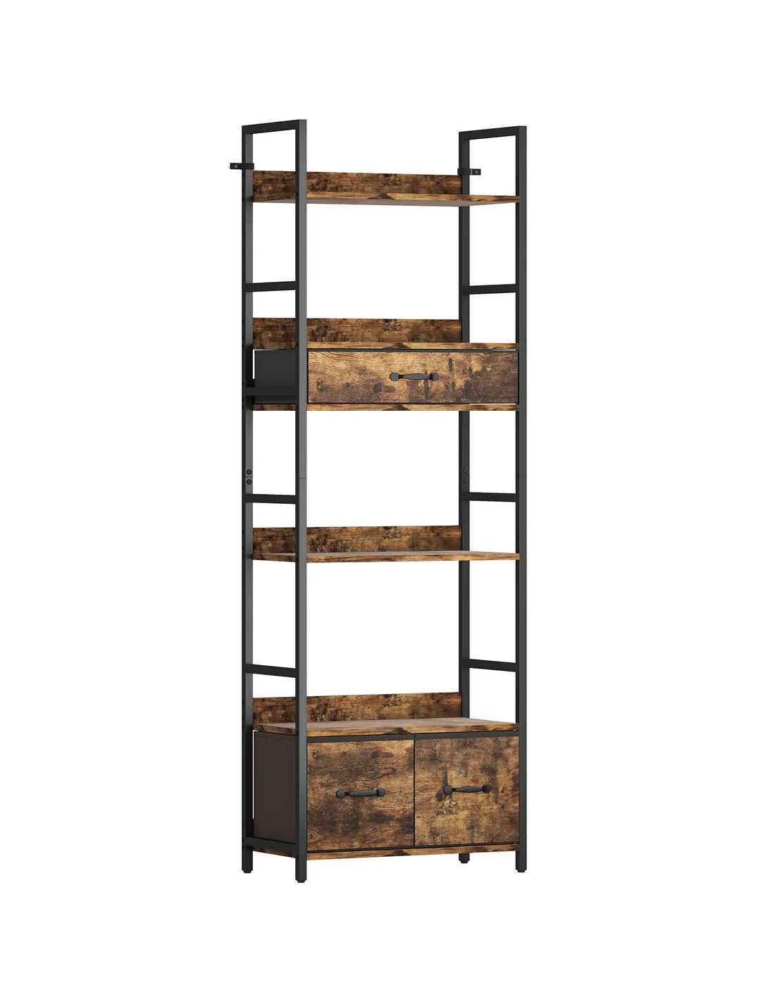 Elevate your home storage with the HOMCOM Industrial Style Bookcase, designed for UK living spaces. This robust unit offers a practical blend of display and discreet organisation. It features four open shelves, perfect for showcasing your favourite books or decorative items. Below, three fabric drawers provide essential concealed storage, helping you maintain a tidy environment. The striking brown wood-effect combined with a black powder-coated metal frame creates a distinct industrial aesthetic. Constructed from durable particleboard and a strong metal core, this bookcase supports an overall load of 50 kg. Adjustable foot pads ensure stable placement on any floor. For added safety, anti-tipping straps come included. The fabric drawers are conveniently foldable, offering flexible storage when needed. Position this versatile piece in your living room, bedroom, study, or hallway for instant character and improved organisation.