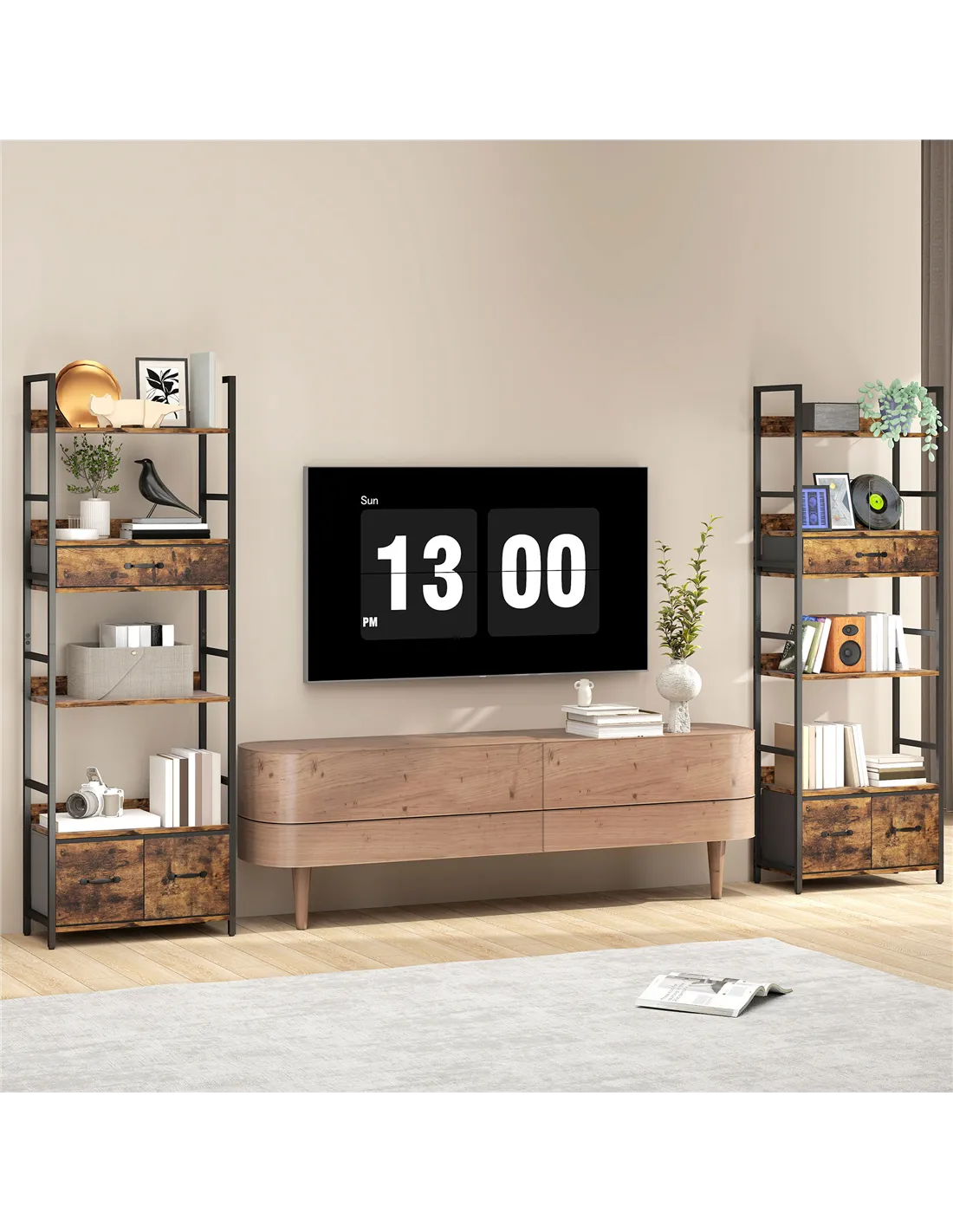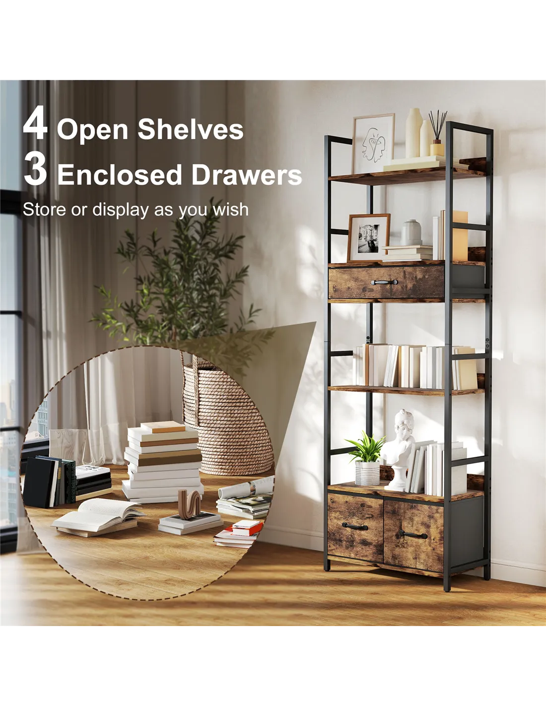 - Features four shelves and three drawers, offering both display and hidden storage
