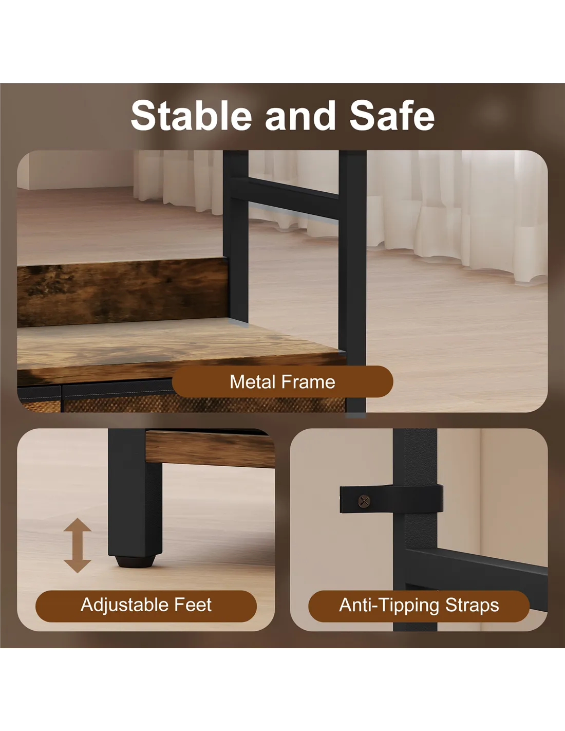 - Adjustable foot pads and anti-tipping straps ensure stability and safety