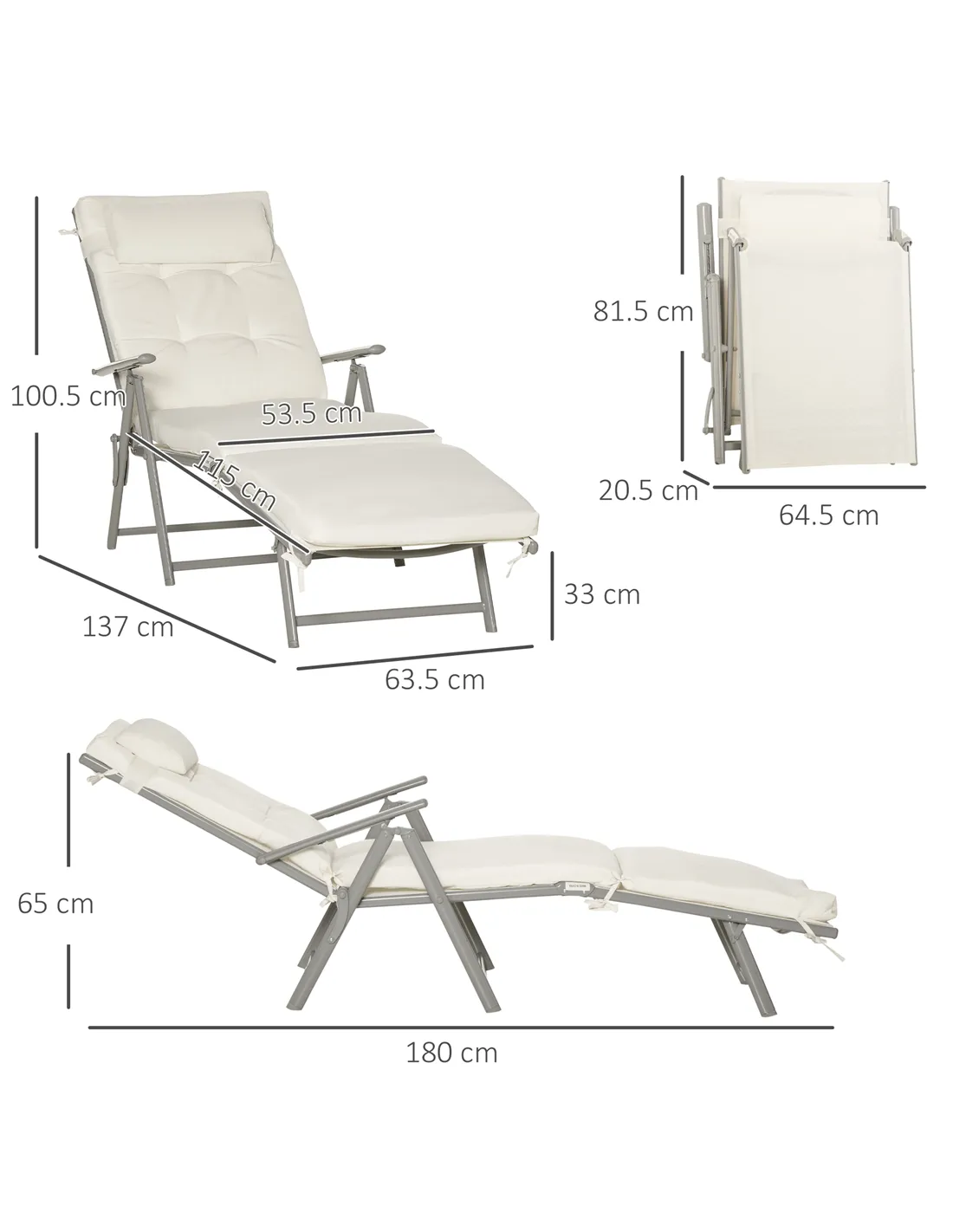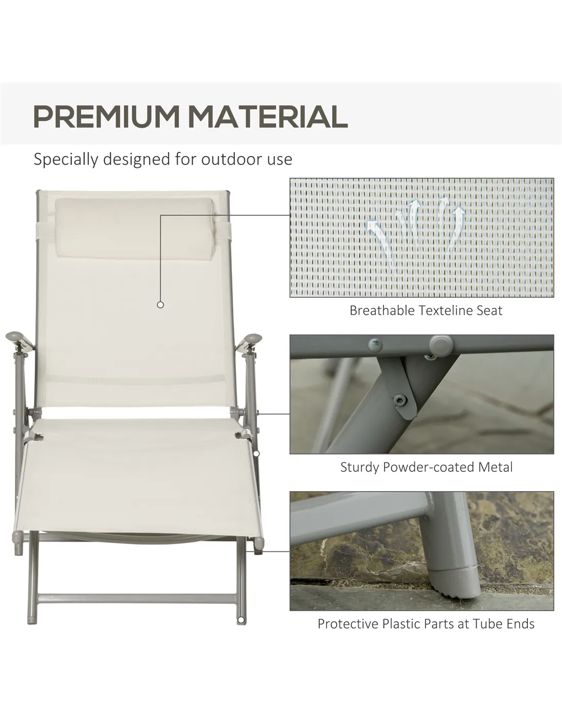 Outsunny Sun Lounger Steel Frame Outdoor Folding Chaise Texteline Lounge Chair Recliner with Headrest & 7 Levels Adjustable Backrest, Cream White