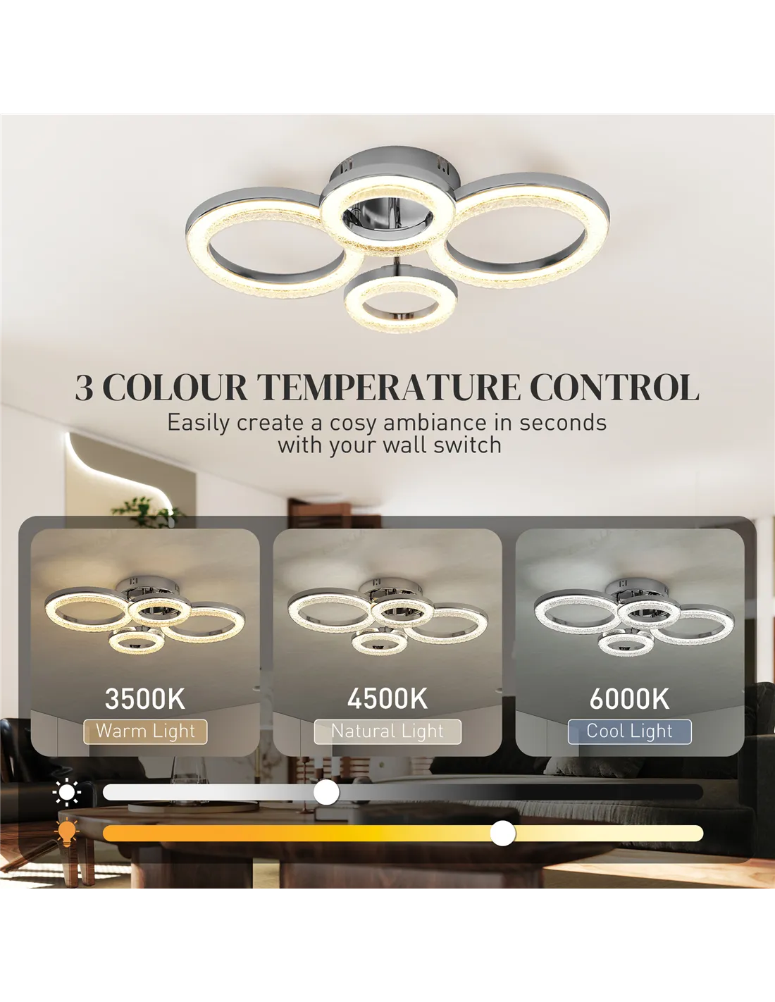 - Switch between 3 colour temperatures with your wall switch for any mood