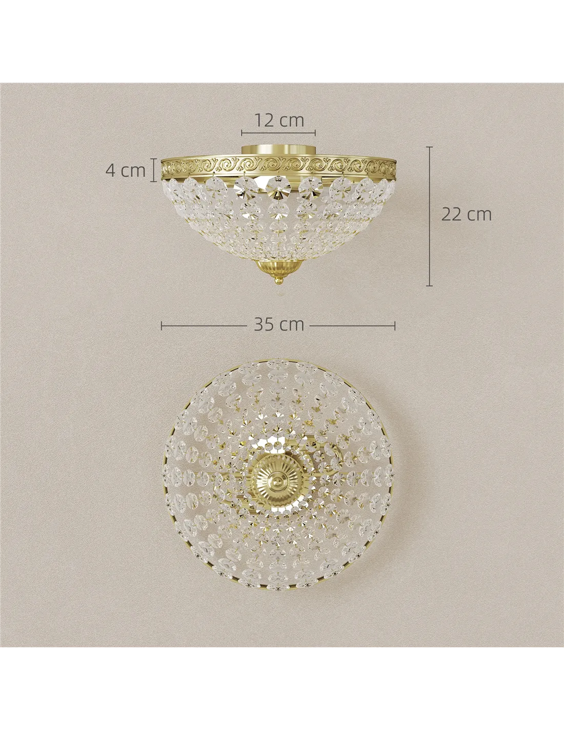 Elevate your UK home's atmosphere with the HOMCOM Crystal Chandelier Ceiling Light from FastDaddy. This vintage 2-light flush mount fixture brightens any living room, bedroom, hallway, or dining room. It features 168 octagonal crystal beads, casting stunning light effects and creating a romantic ambience. Dual E14 sockets provide brighter, more even illumination throughout your space. The classic retro design complements various home décors, including modern and country styles. Crafted from a durable metal base and high-grade crystal, this ceiling light ensures long-lasting use. Its compact flush mount design suits different room sizes within your UK residence. Transform your evenings into special, bright moments with this elegant gold-tone chandelier.