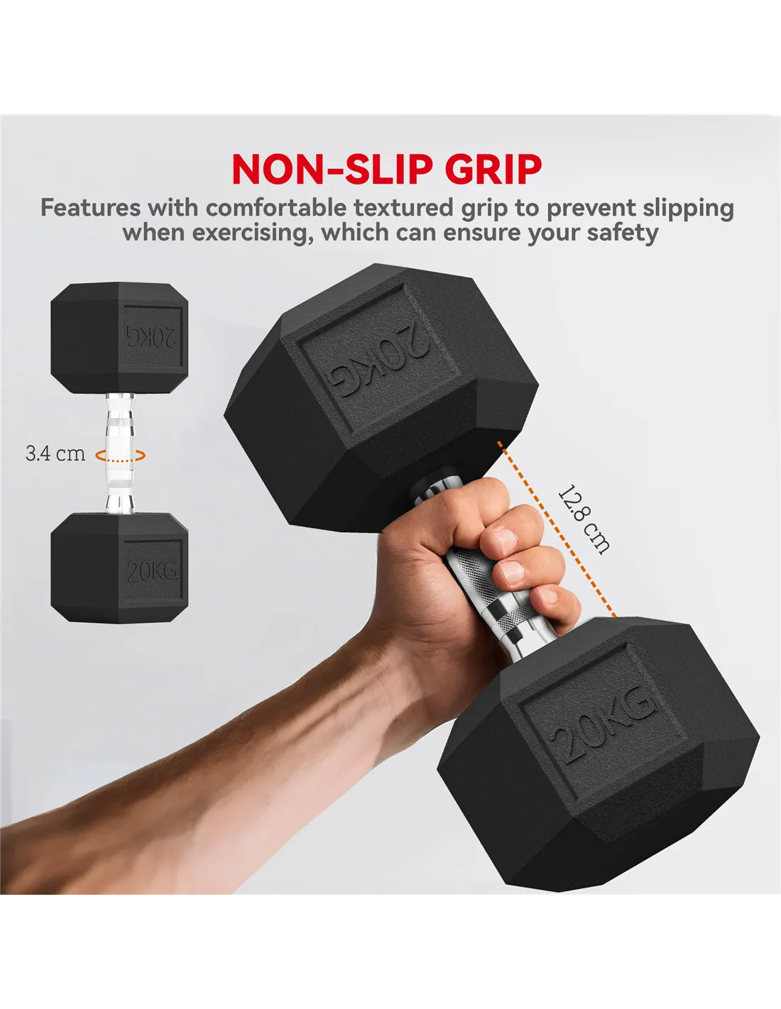 - Rubber covered ends for safety when dropped, hexagon shape stops weight rolling