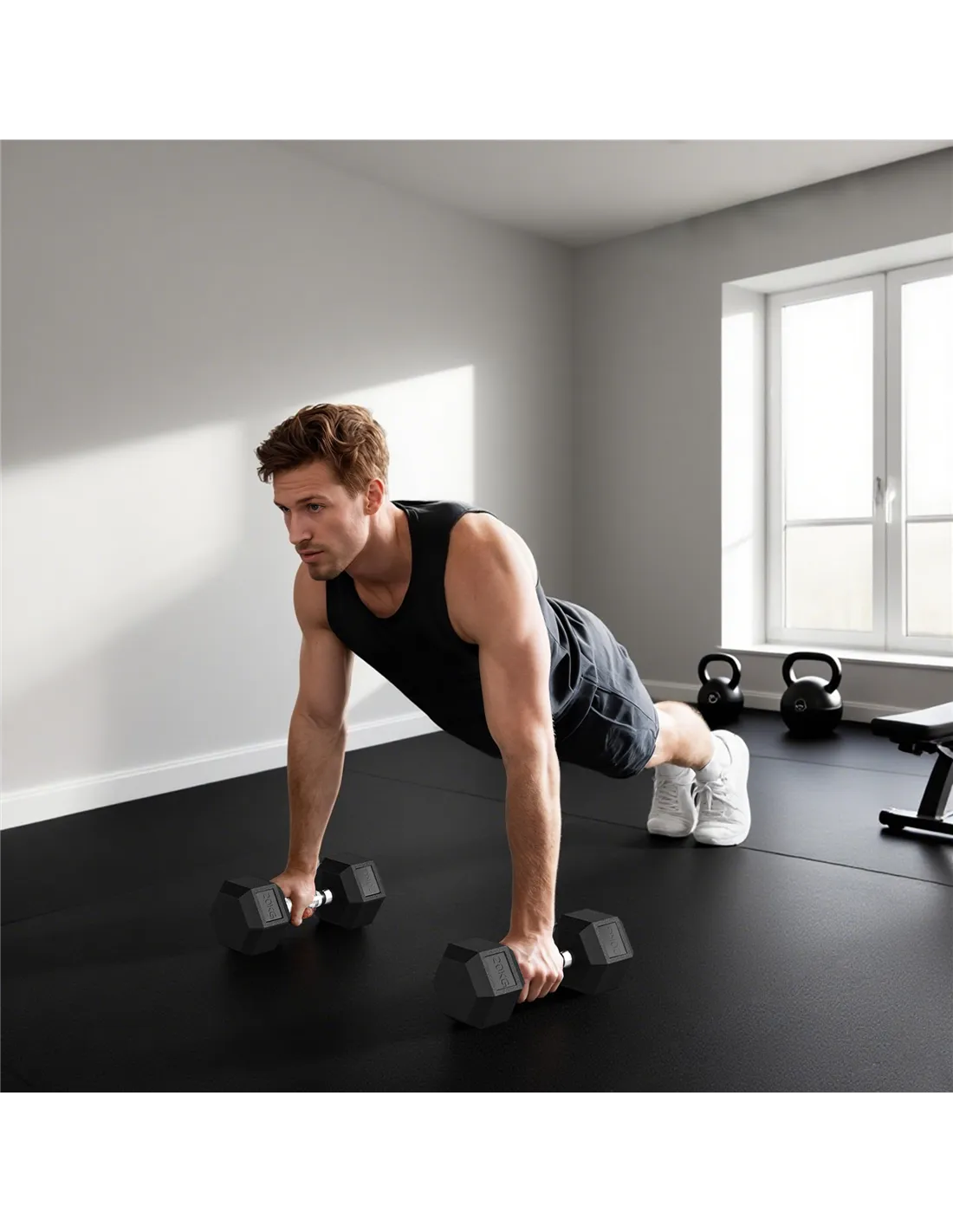 - A: The hexagonal shape of the dumbbell ends prevents them from rolling away when placed on the floor, enhancing safety and protecting surfaces.