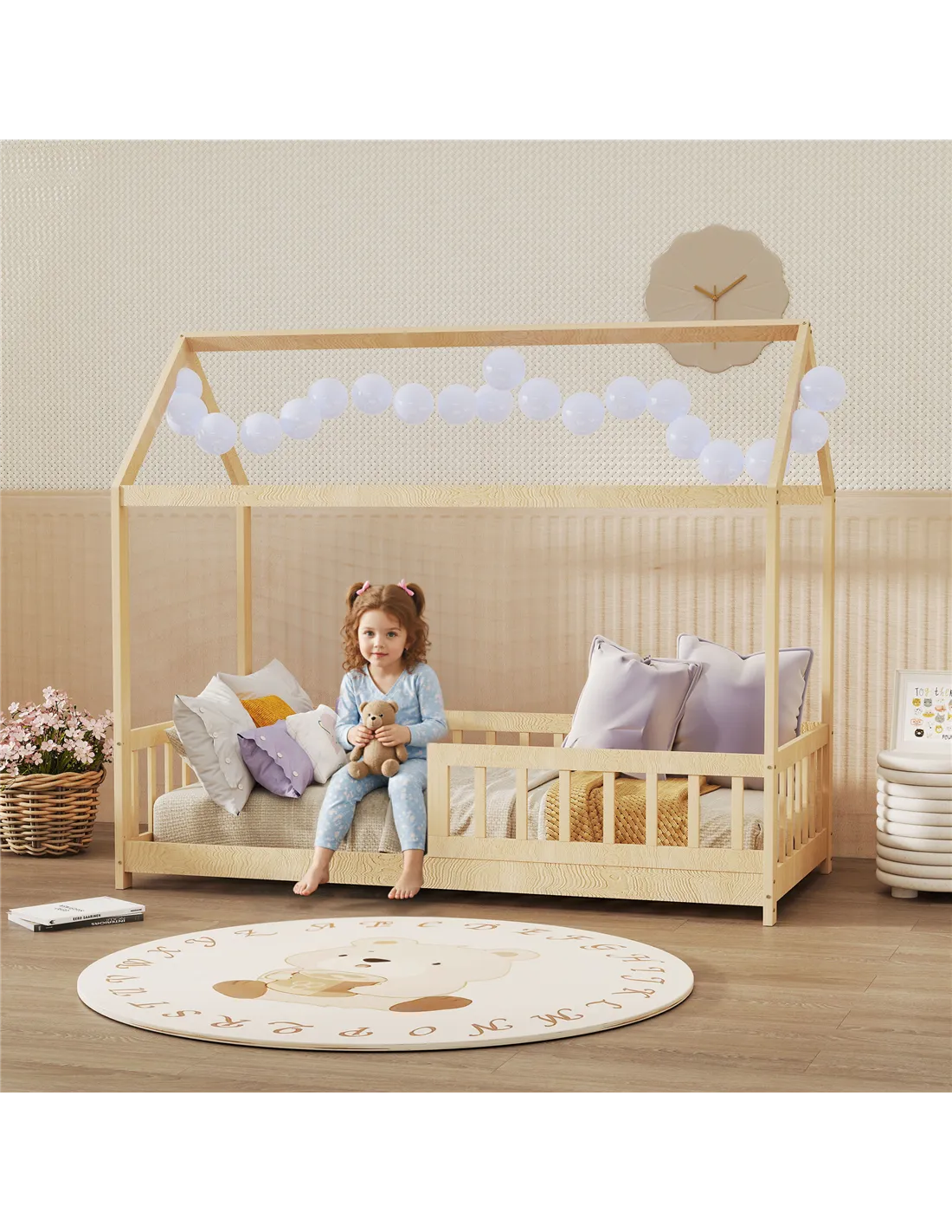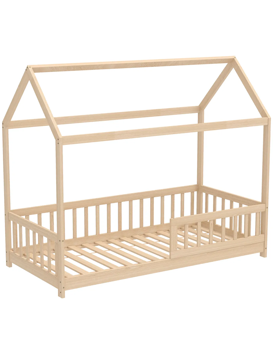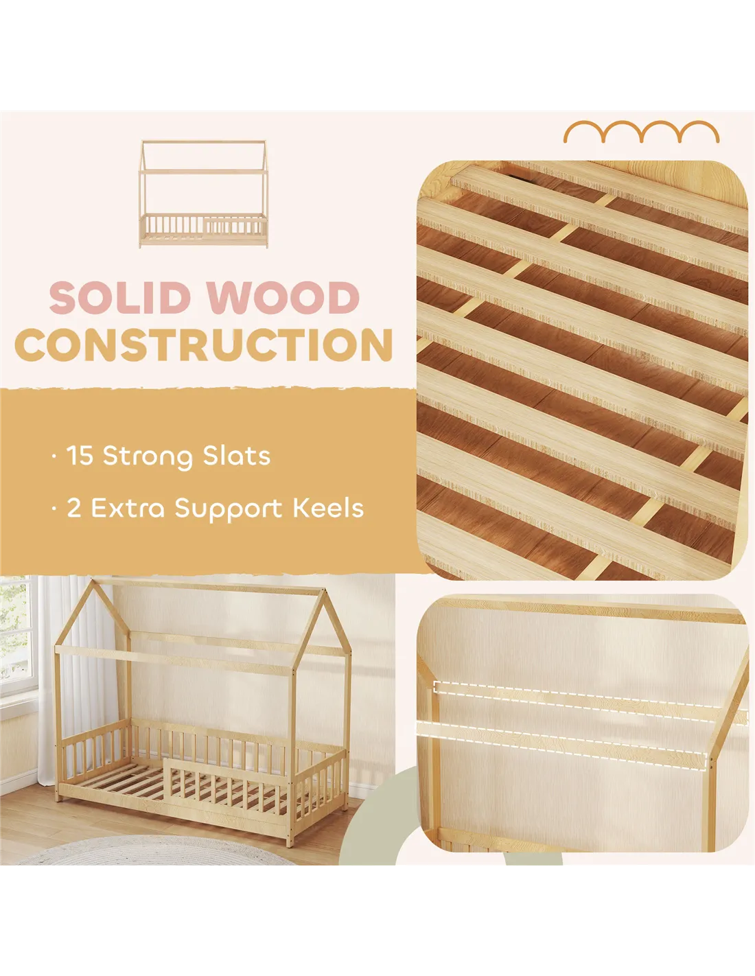 HOMCOM House-Shaped Kids Bed Frame with Guard Rails, Solid Pine Wood Single Bed Frame for Kids Boys and Girls, Natural