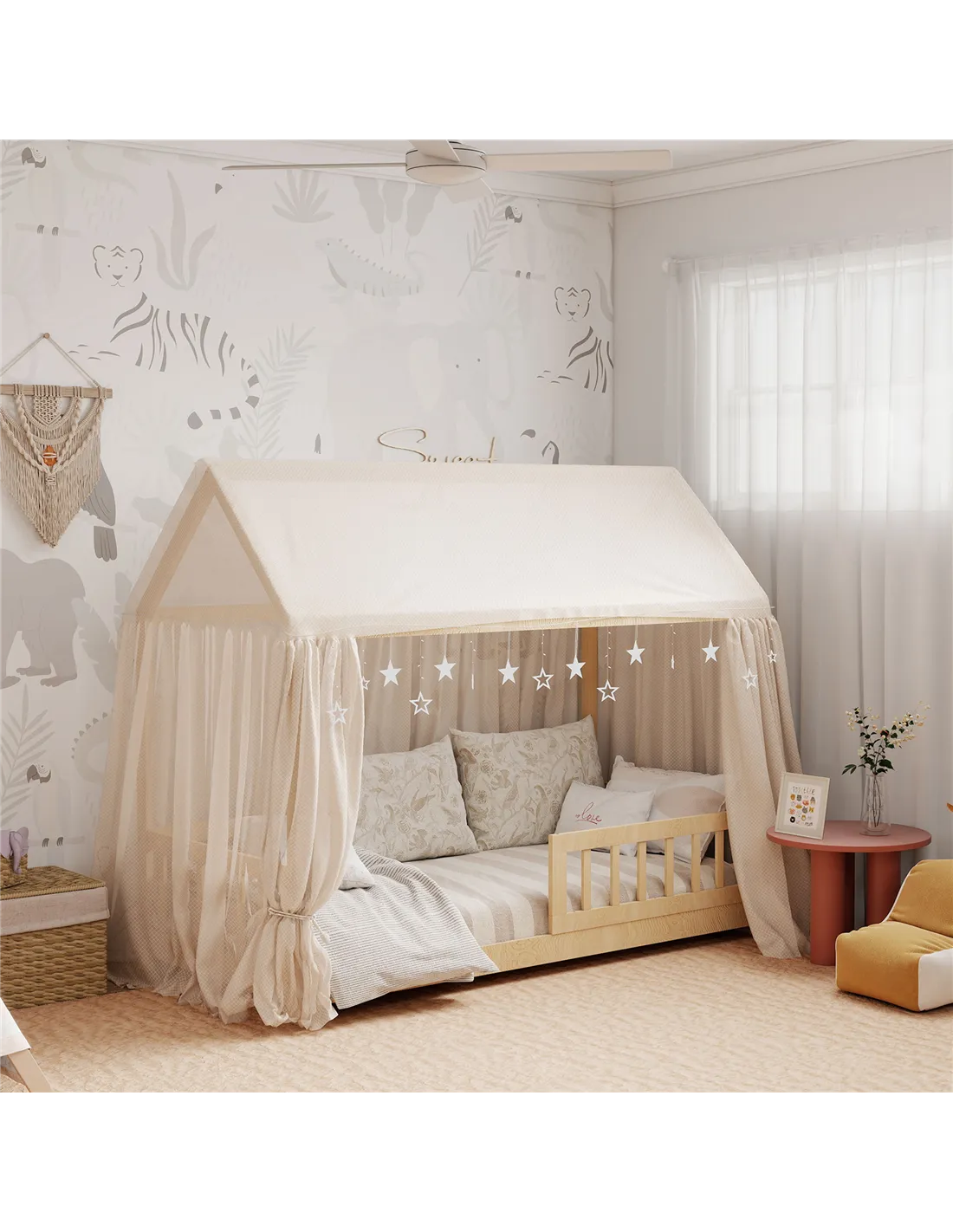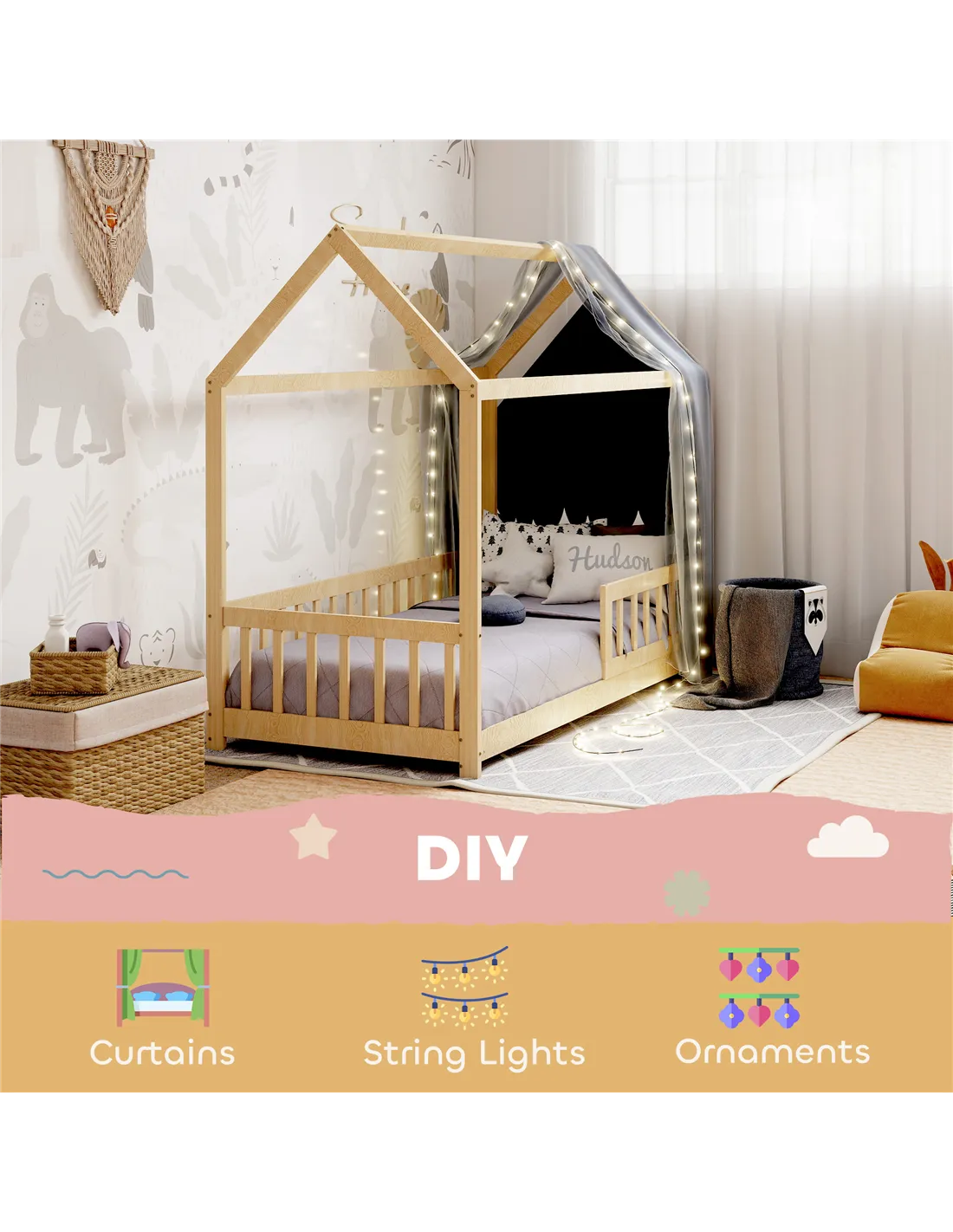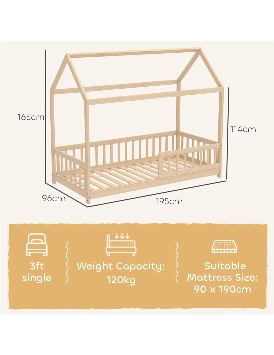 The HOMCOM House-Shaped Kids Bed Frame offers a secure and imaginative sleep space for children. This single bed frame, made from solid pine wood with a natural finish, suits both boys and girls. Its distinctive house design allows children to personalize their bedroom by adding lights, curtains, or favourite ornaments. Guard rails surround the frame, providing essential security and ensuring peaceful sleep. Crafted for durability, the bed features a robust solid wood construction with 15 slats and two additional keels. This design supports a weight capacity of 120 kg. The frame boasts a smoothly polished, burr-free surface and a finely painted finish for safety and elegance. It accommodates a 190L x 90W cm mattress within overall dimensions of 195L x 96W x 165H cm. Assembly is required to create this engaging and reliable sleep environment.