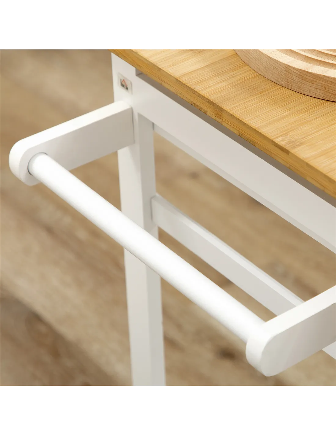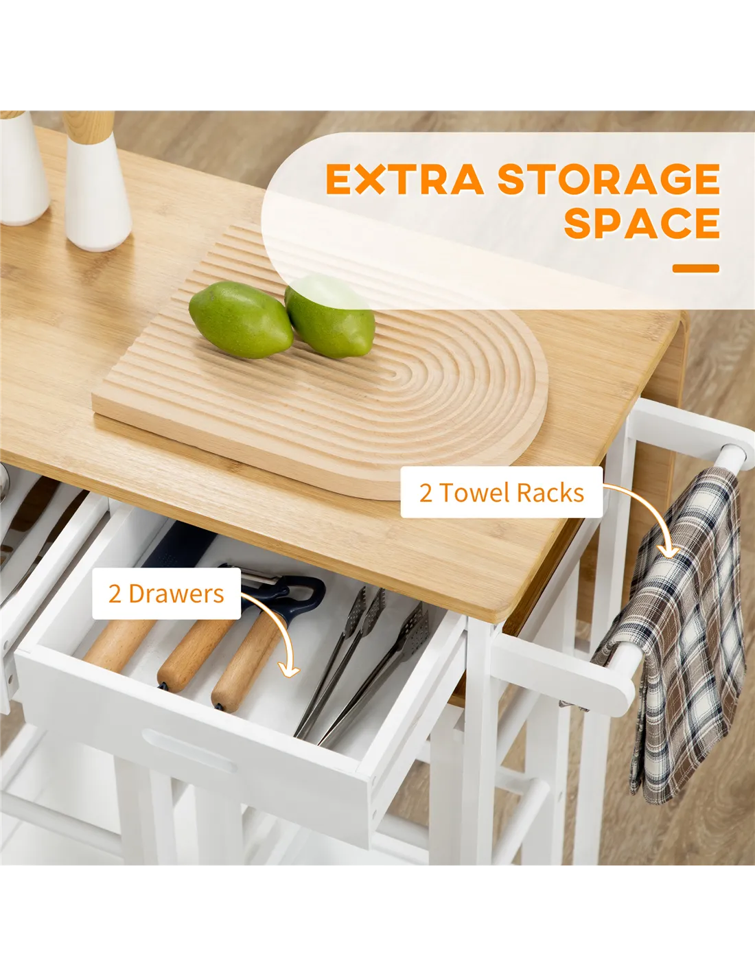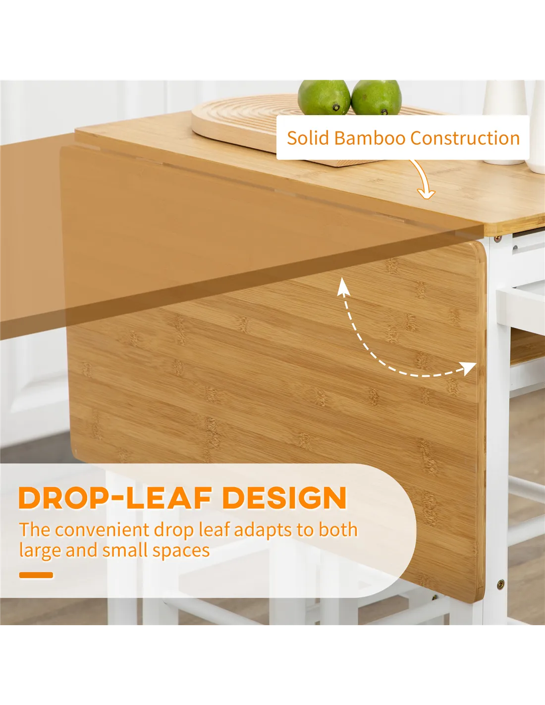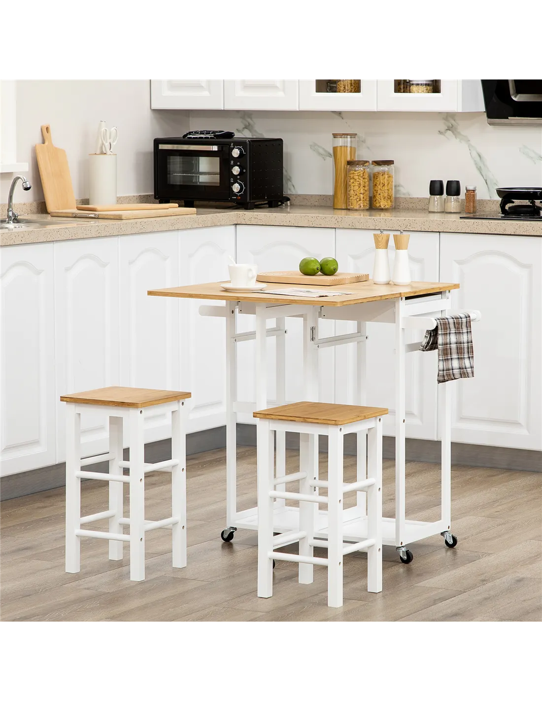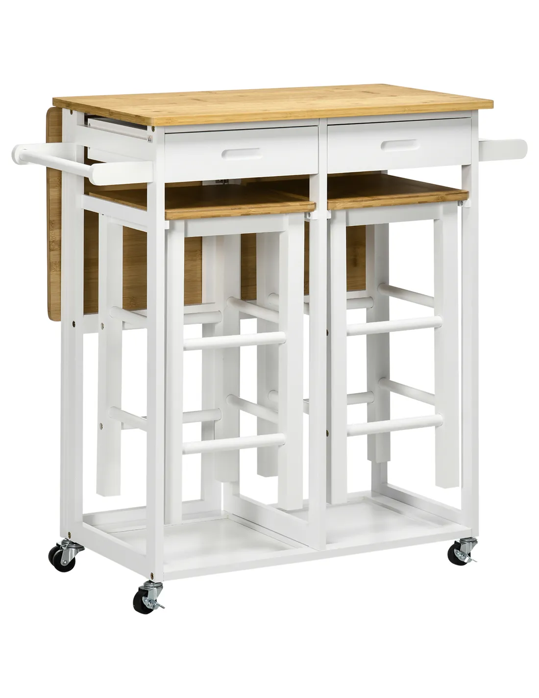 Enhance your kitchen space with the HOMCOM Kitchen Island Set, a practical addition for any UK home. This versatile white bamboo breakfast cart delivers a 2-in-1 solution, combining a drop leaf table with two matching stools. It provides a flexible dining area for you and company. Extend the tabletop easily for extended use. Store smaller essentials within the two integrated drawers, keeping items accessible. The stools neatly slide directly under the table, optimising valuable floor space when not needed. Four smooth-rolling wheels enable effortless repositioning within your home, with two lockable brakes securing the unit in place. Crafted from sturdy, durable bamboo, this set offers functional design. Enjoy added convenience from the built-in towel rack. This compact, adaptable furniture piece requires assembly.