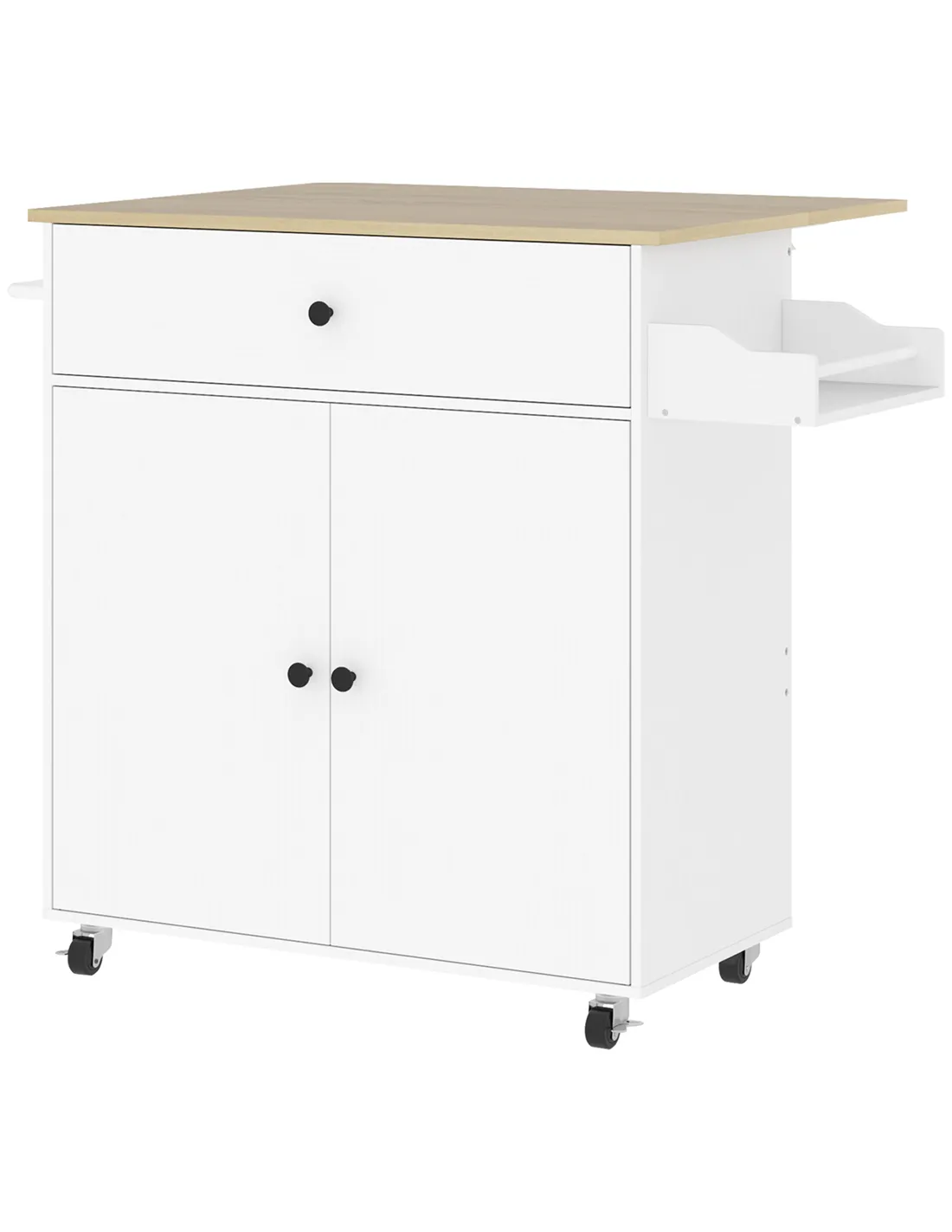 The HOMCOM Rolling Kitchen Island offers a smart storage and workspace solution for UK homes. This versatile white kitchen cart features a practical drop-leaf countertop. Easily extend your work area for meal preparation or fold it away for compact living. You gain organised storage with a smooth-gliding drawer and a two-door cabinet. The cabinet includes a three-level adjustable shelf, adapting to your specific storage needs. Enhance your kitchen further with integrated side spice and towel racks. Four robust wheels ensure easy movement, with two brakes providing stability when in use. Crafted from durable particleboard and MDF, the surface has a melamine coating for simple cleaning. This functional island doubles as a chic dining or breakfast table, delivering adaptability and style to any British kitchen. Assembly is required to set up your new kitchen asset.
