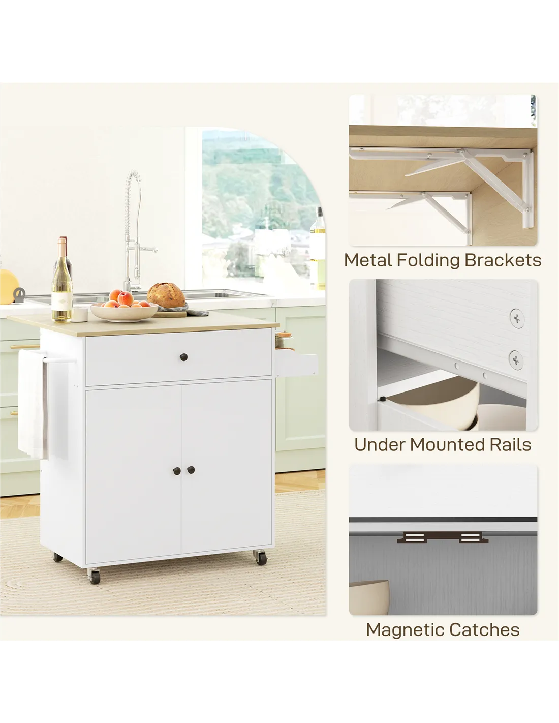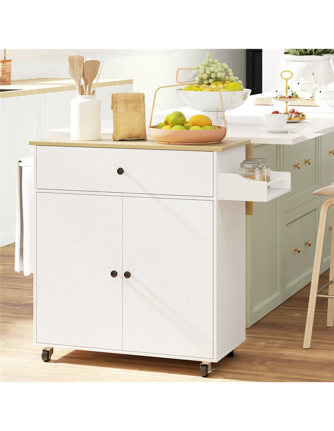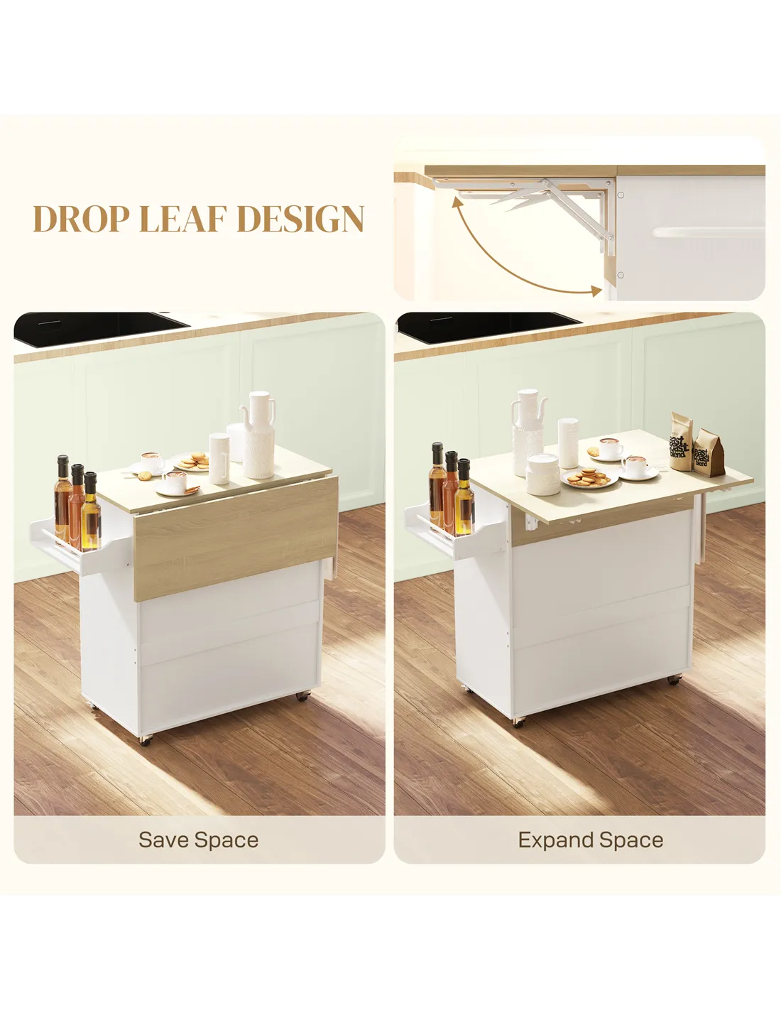 - A: The kitchen island features a drop-leaf tabletop that expands or folds to save space, adapting to your needs.