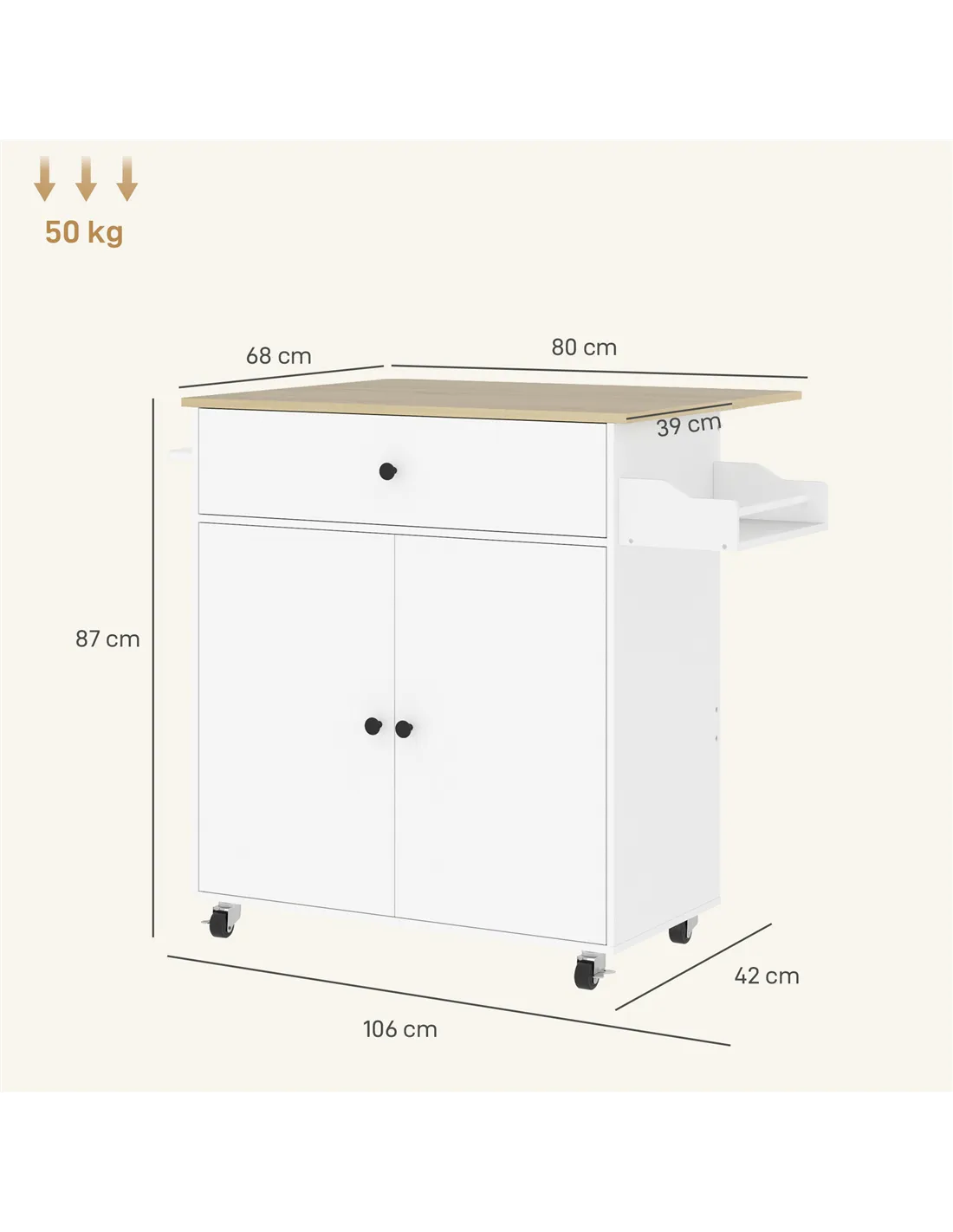 - Weight Capacity: 5 kg (drawer), 5 kg (shelf), 20 kg (top), 10 kg (bottom), 5 kg (spice rack), 50 kg (total)