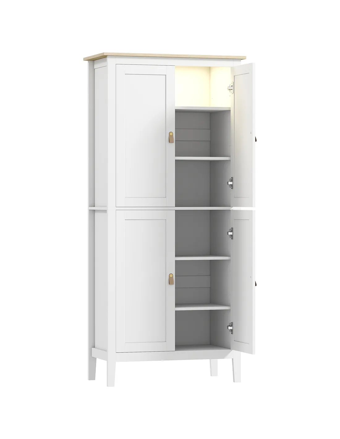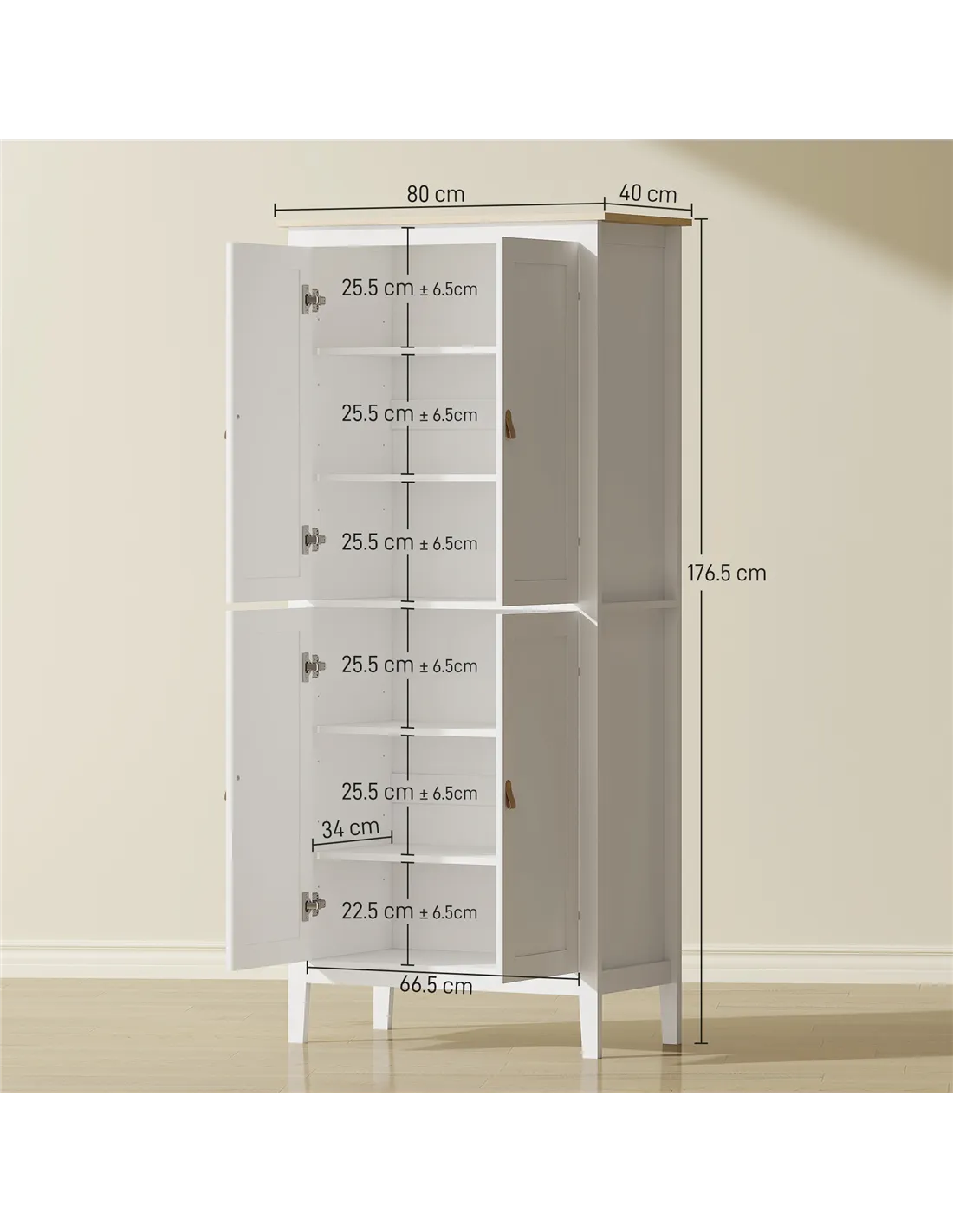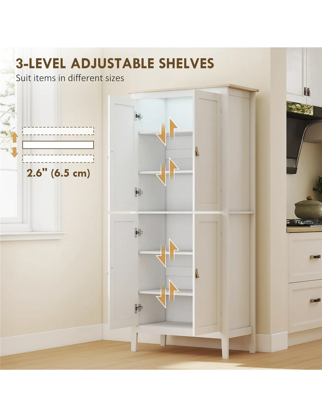 - A: The cupboard provides six-tier storage across two compartments. It includes four shelves, each adjustable to three different levels, offering flexible storage for various pantry items.