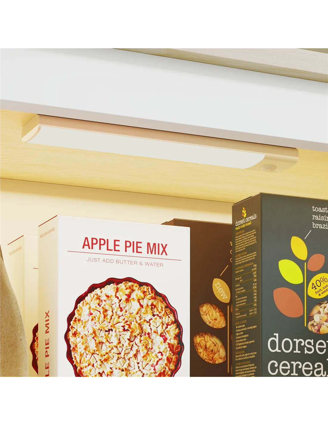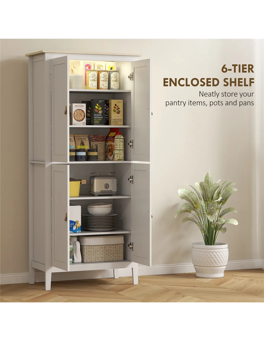 - Six-tier storage in two cupboards holds pantry items and more